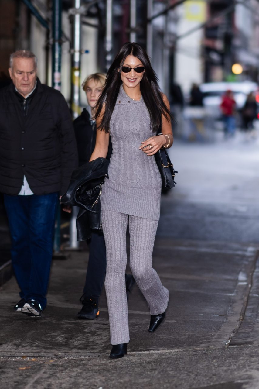 Bella Hadid早前因萊姆病復發而淡出公眾視線,近日她以「Dress-Over-Pants」造型帶來眼前一亮的效果。這位超模再度把街頭當作伸展台,與好友Devon Lee Carlson現身East Village,她以灰色為主色調,來自Frankies Bikinis的灰色針織套裝洋溢著溫柔氣息,無袖針織上衣凸顯纖細手臂,修身剪裁勾勒身材比例,與之相配的是一條高腰直筒針織褲,構成極具現代感的輪廓,呈現漫不經心的鬆弛感。此外,她還搭配黑色尖頭皮靴,小巧而精緻的太陽眼鏡,肩背Givenchy Voyou黑色手袋,營造瀟灑愜意的氛圍感。晚些時候,Bella Hadid穿Sturgis moto黑色外套,並將黑色太陽眼鏡換成金屬鏡框眼鏡,展現復古摩登格調。