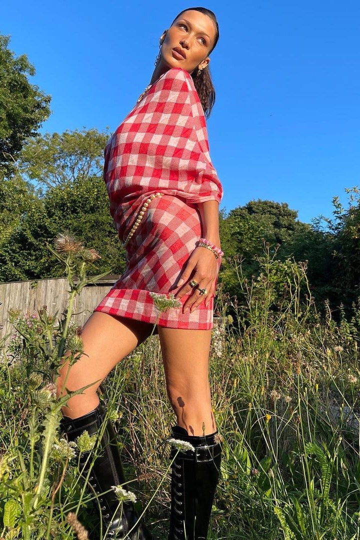 Bella 在最近一次出行,穿上了一條早期流行的裙款,搭配着駝色吊帶衫和一雙黑色皮靴——以她對所有復古事物的偏愛而聞名,來自她最喜歡的倫敦 Depop 商店 Susamusa。 事實上,最近幾個月有人發現她穿著許多來自該品牌的單品,其中包括 8 月份由 90 年代布料製成的兩件式單品。