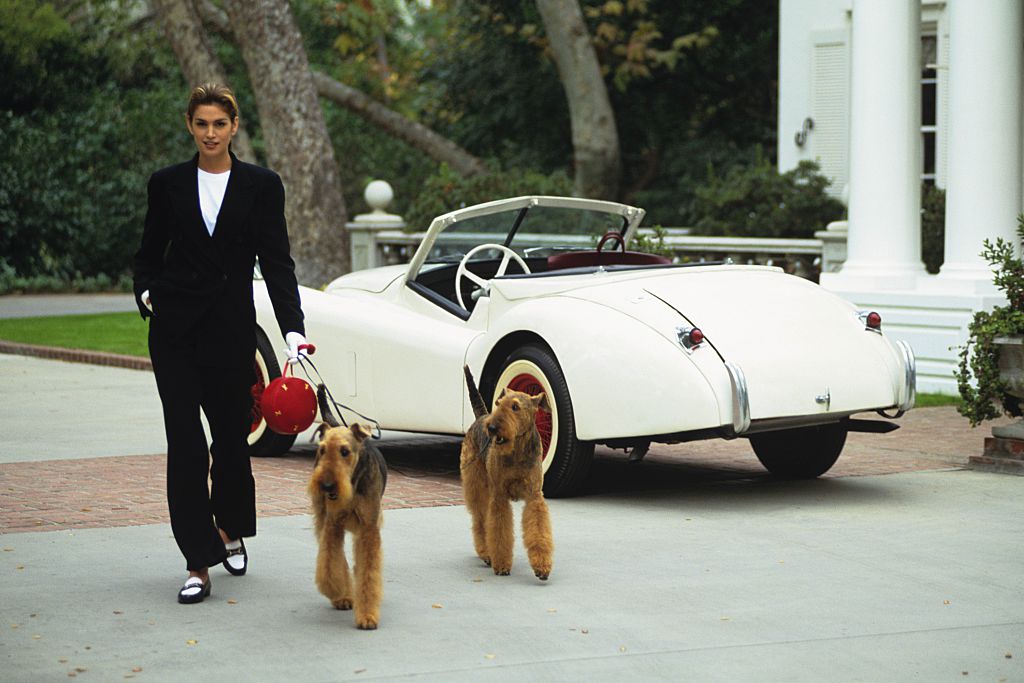 Vogue 1992 Cindy Crawford walking two dogs