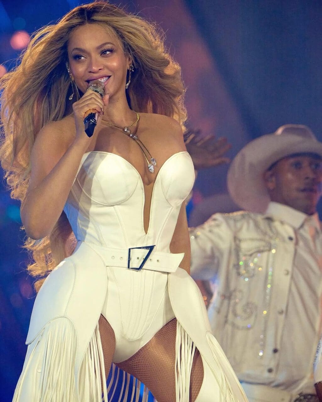不出所料,這位超級巨星在她的演唱會上使出了渾身解數: 她不僅表演了 Cowboy Carter 的曲目,如 《American Requiem》 (她的開場曲)、《Ya-Ya》和 《Levii’s Jeans》,還表演了「《Crazy In Love》 和《Formation》等經典熱門曲目。她的女兒 Rumi 和 Blue Ivy 甚至在台上客串了她的伴舞。最精彩的部分是什麼?Beyoncé 邀請一眾頂尖設計師為舞台量身打造的所有的服飾,並由 Shiona Turini 、Karen Langley 負責造型。