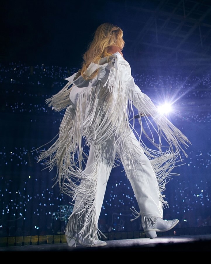 不出所料,這位超級巨星在她的演唱會上使出了渾身解數: 她不僅表演了 Cowboy Carter 的曲目,如 《American Requiem》 (她的開場曲)、《Ya-Ya》和 《Levii’s Jeans》,還表演了「《Crazy In Love》 和《Formation》等經典熱門曲目。她的女兒 Rumi 和 Blue Ivy 甚至在台上客串了她的伴舞。最精彩的部分是什麼?Beyoncé 邀請一眾頂尖設計師為舞台量身打造的所有的服飾,並由 Shiona Turini 、Karen Langley 負責造型。