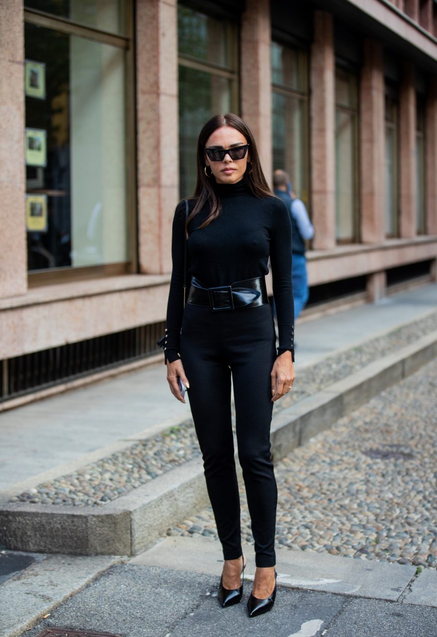 《Vogue 》團隊專注於帶有優雅開衩的拉鍊款,以展示其鞋子。 正如 Sarah Harris所說,黑色緊身褲非常百搭——白天搭配休閒 T 恤和運動鞋看起來很輕鬆,但晚上搭配閃亮的上衣和高跟鞋也很好看。