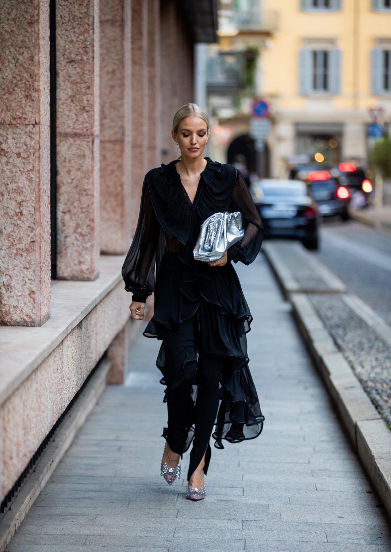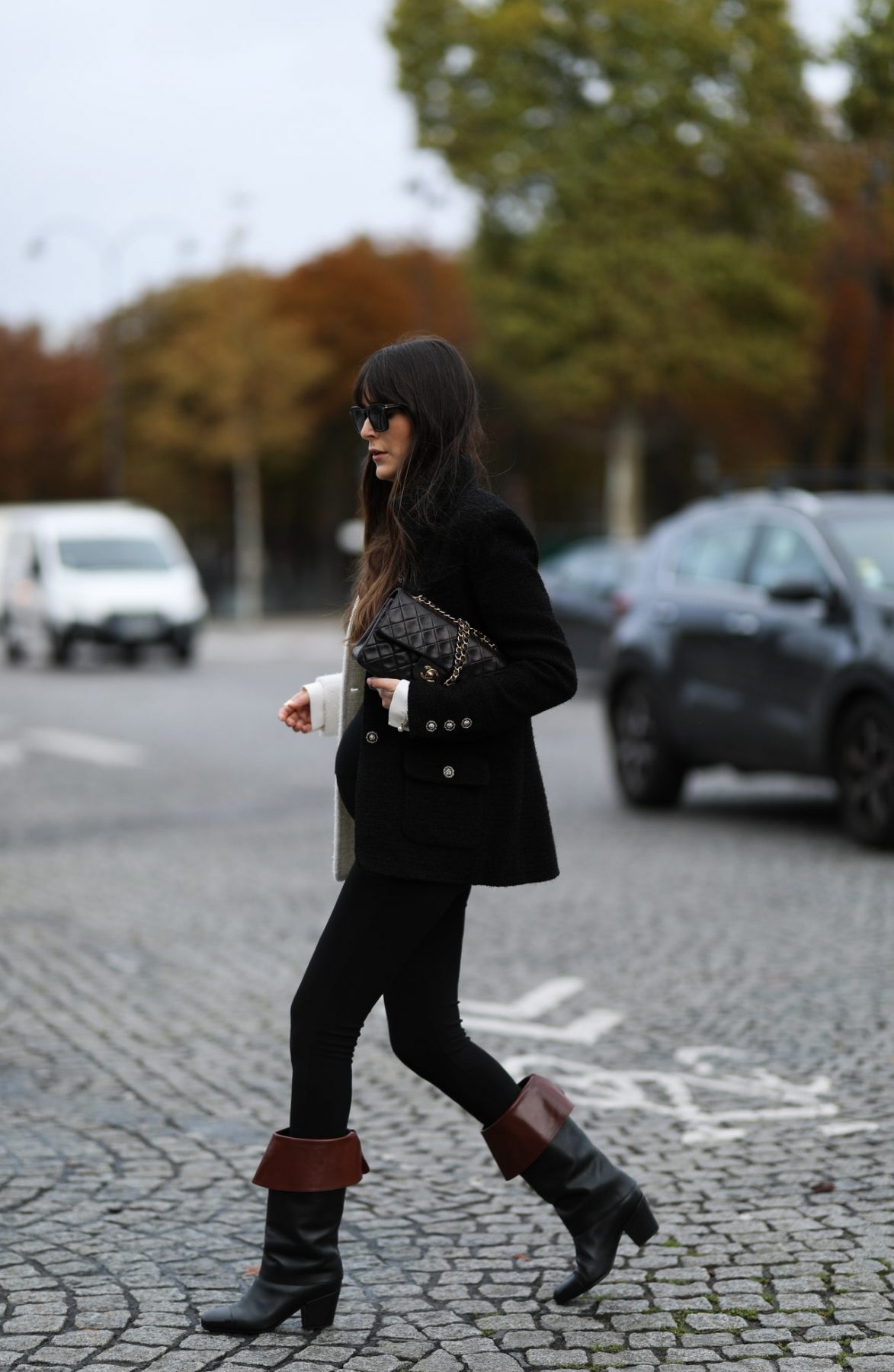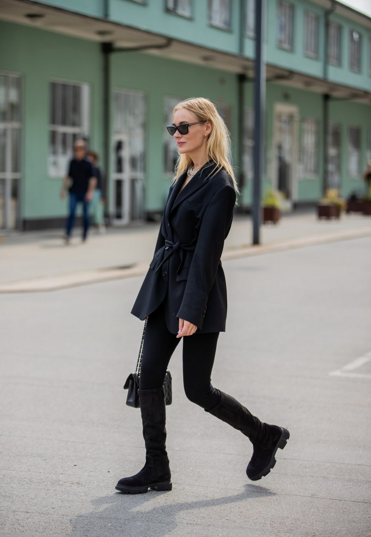 《Vogue 》團隊專注於帶有優雅開衩的拉鍊款,以展示其鞋子。 正如 Sarah Harris所說,黑色緊身褲非常百搭——白天搭配休閒 T 恤和運動鞋看起來很輕鬆,但晚上搭配閃亮的上衣和高跟鞋也很好看。