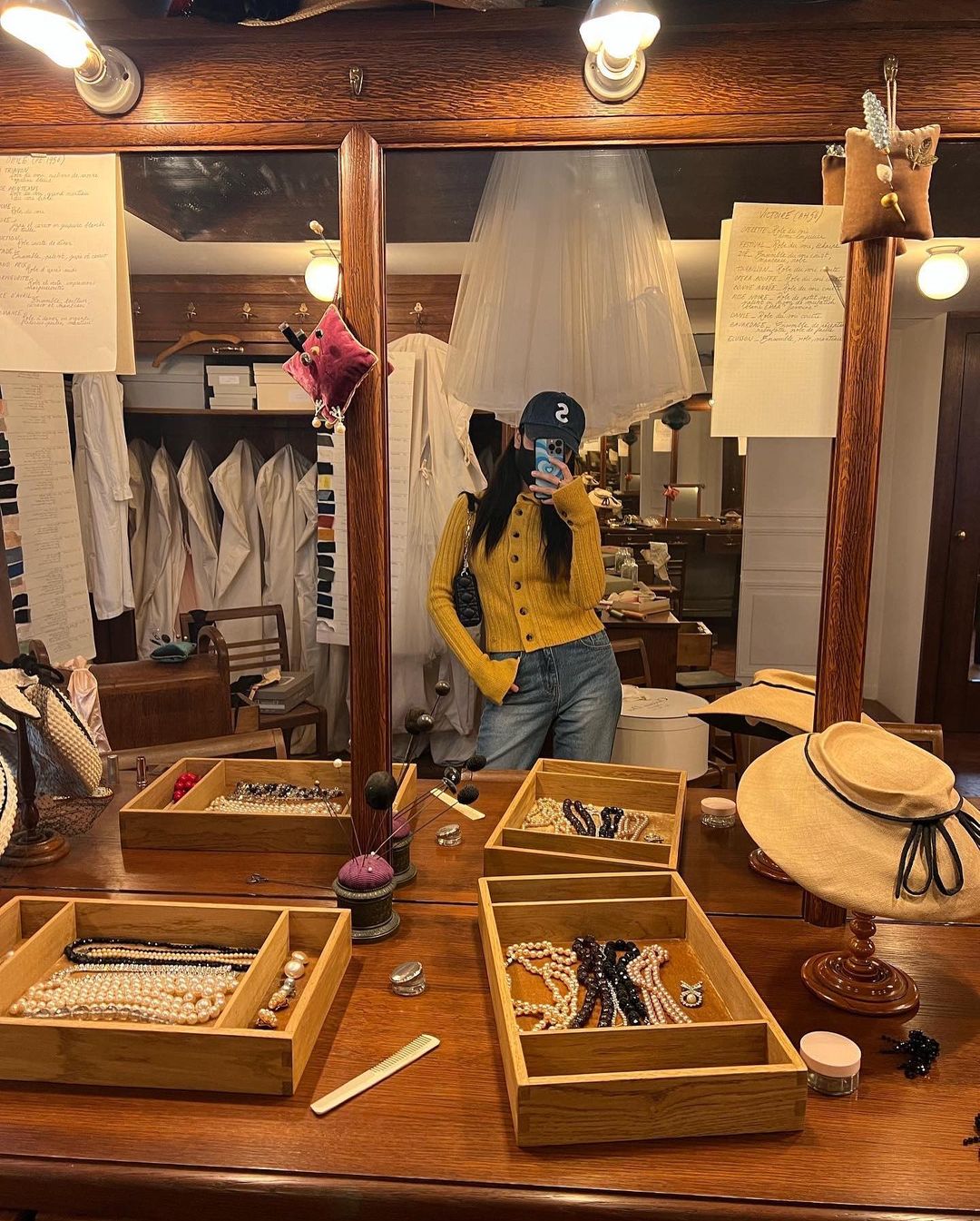 當中 Jisoo 更有幸參觀旗艦店下面的Christian Dior 先生剛開始創立 Dior 的工作室原貌,罕見看到當時傳統的工作室結構、裁縫工具、筆記等等。原來當時的模特兒更是自己為自己化妝,並從這個工作室內完整著裝後,便步出店舖展示 Christian Dior 先生的全新服裝。