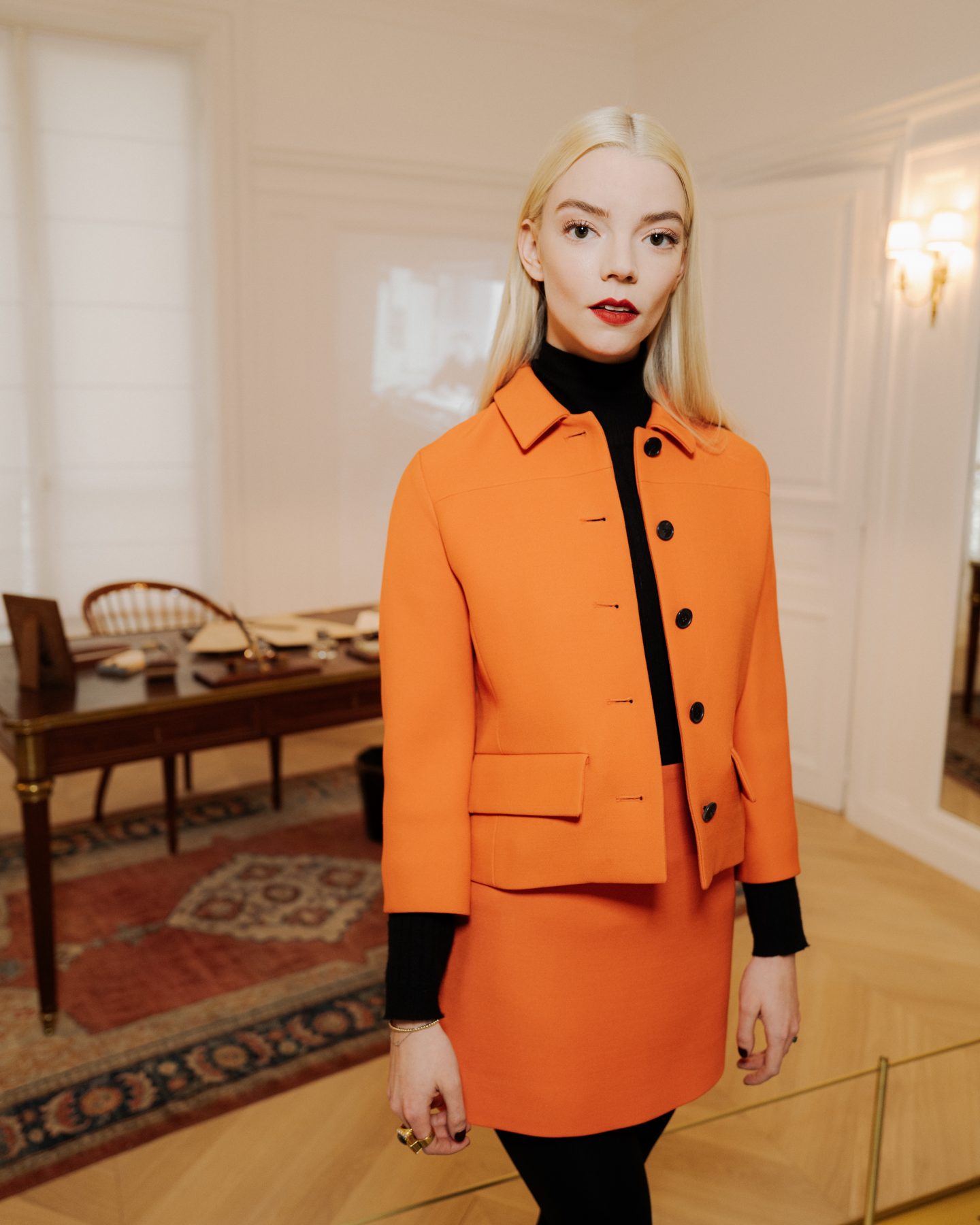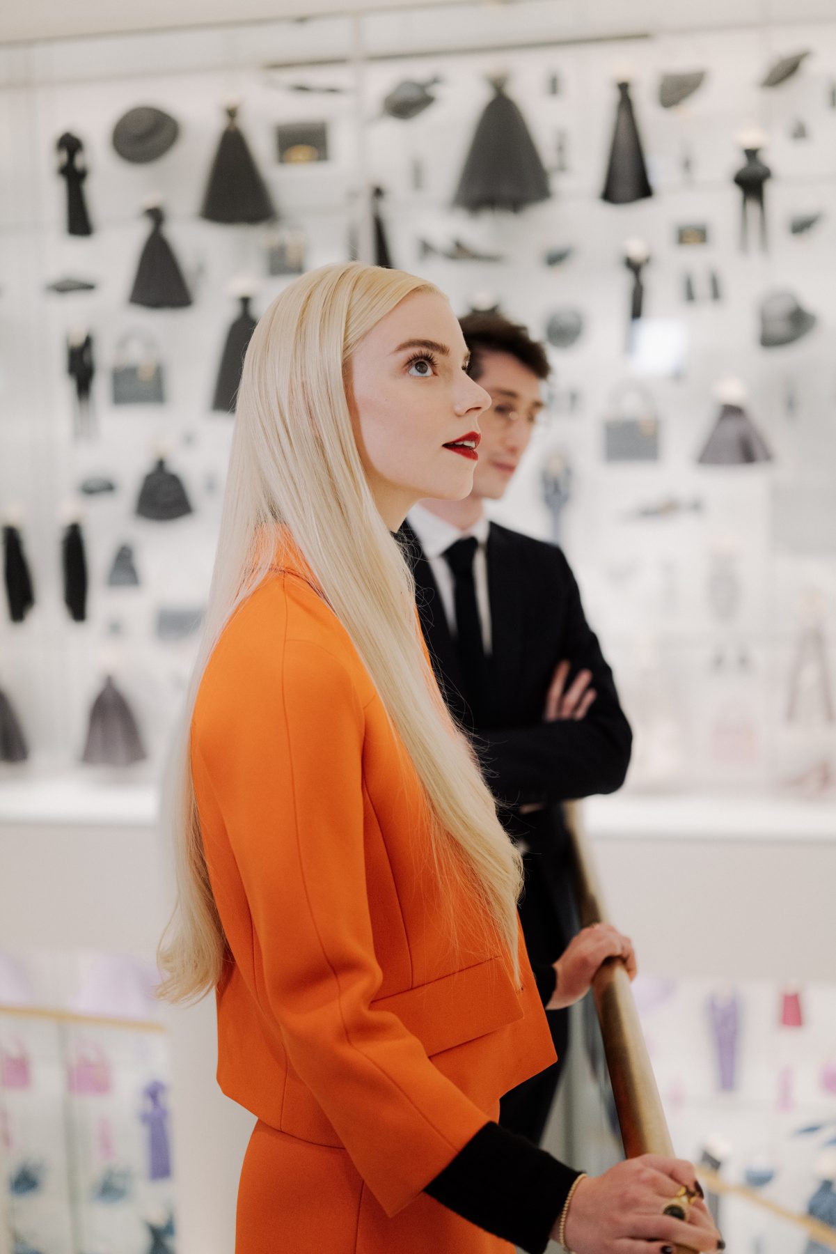Anya Taylor-Joy 身穿2022春夏系列的橙子套裝,以品牌代言人身分率先參觀全新 Dior 巴黎蒙田大道30號總店。Anya Taylor-Joy 被一面超過3層樓高的彩虹裝飾牆所吸引,上展示了共1874個 Dior 設計擺設,全都是經典的紅地毯設計、手袋以及標誌式輪廓。