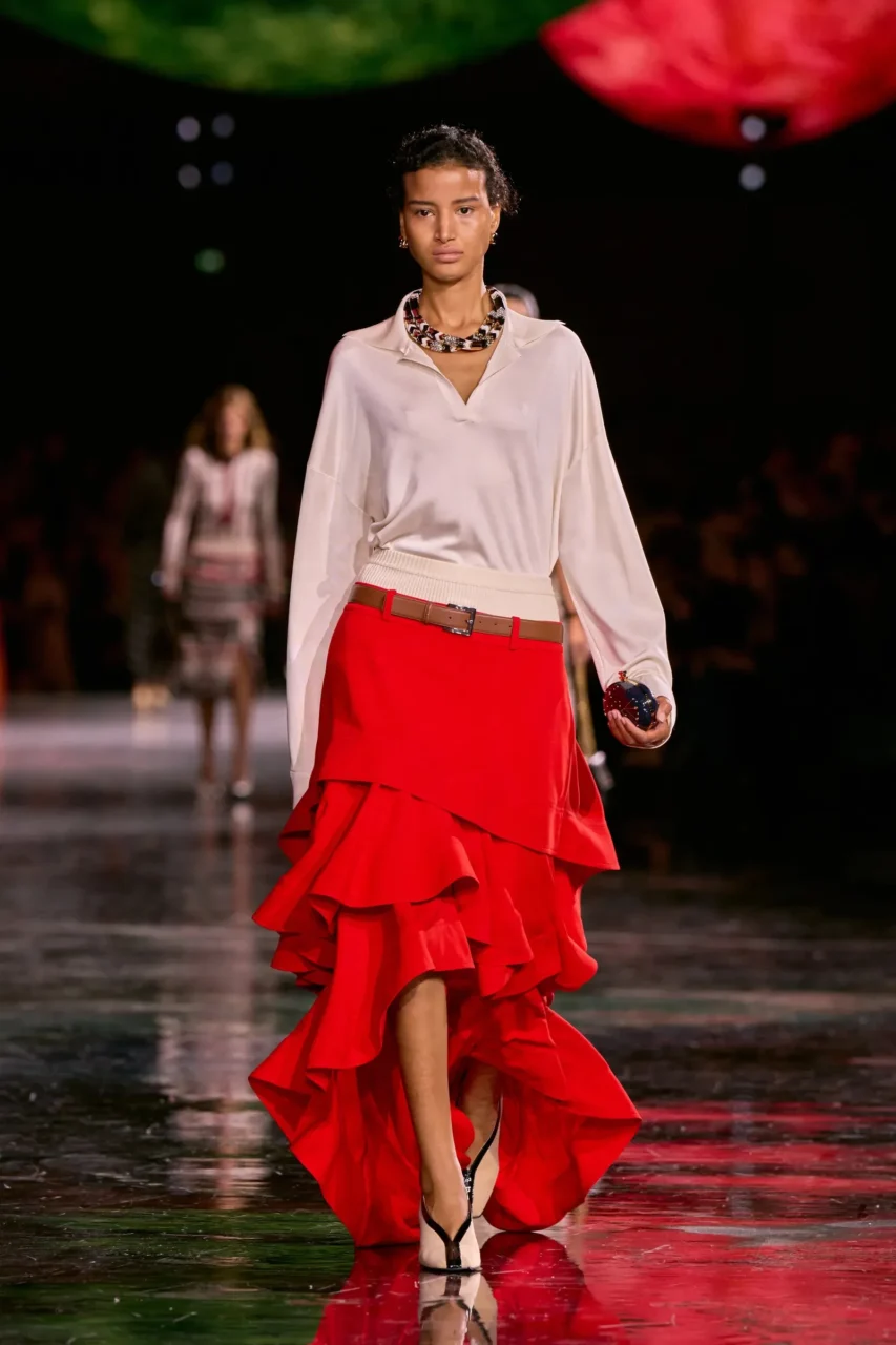 在 Saint Laurent,創意總監 Anthony Vaccarello 打造出帶有印花圖案的輕盈百褶長裙,展現永恆的優雅氣質;Elie Saab 則專注於流動感,以精緻上衣搭配飄逸長裙組成套裝;Chloé 透過輕透的裙擺重現 70 年代波希米亞精神;Blumarine 則以性感開衩造型帶大家回歸令人矚目的千禧年代;而在新任創意總監 Matthieu Blazy 帶來的 Chanel 2026 春夏系列時裝秀上,波希米亞長裙以火焰般鮮紅的層疊設計呈現,展現設計師對鮮明色彩的駕馭能力。