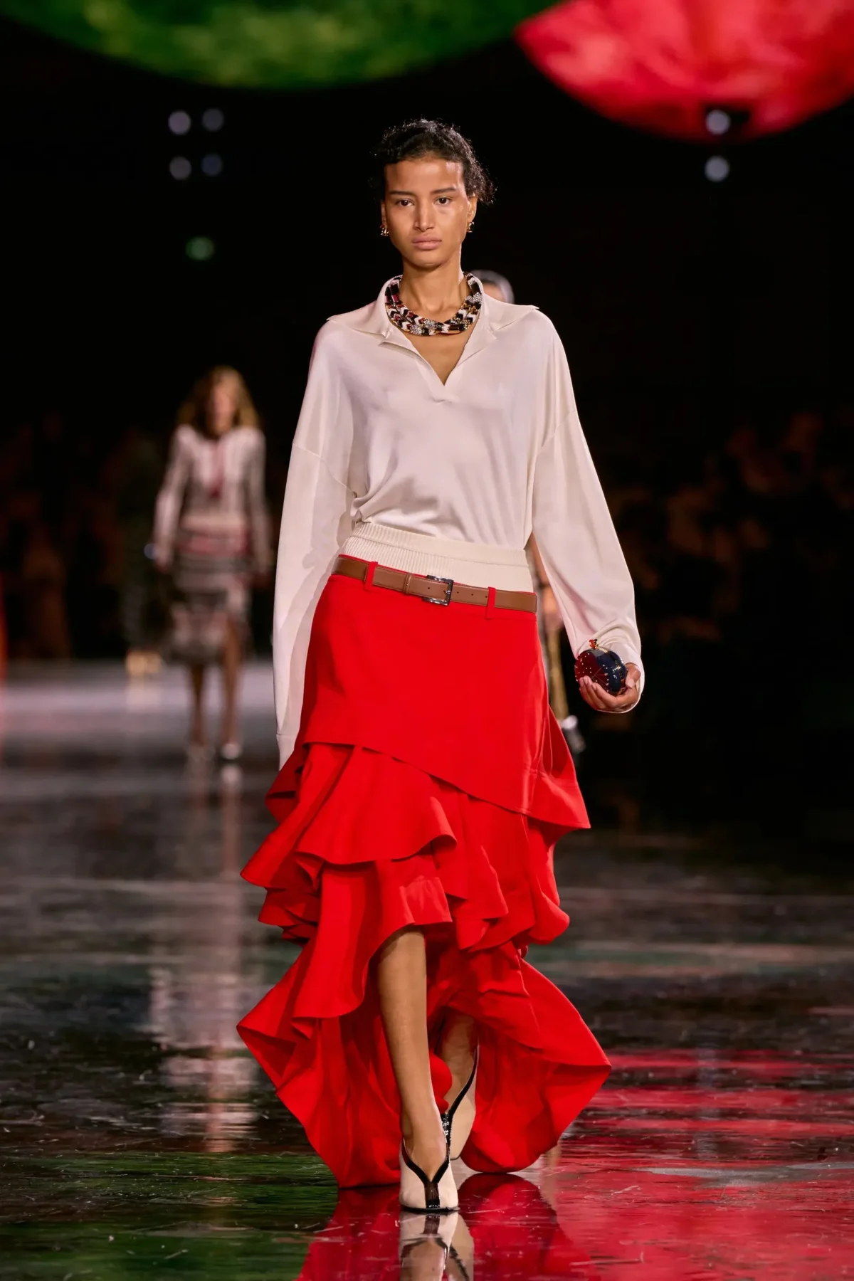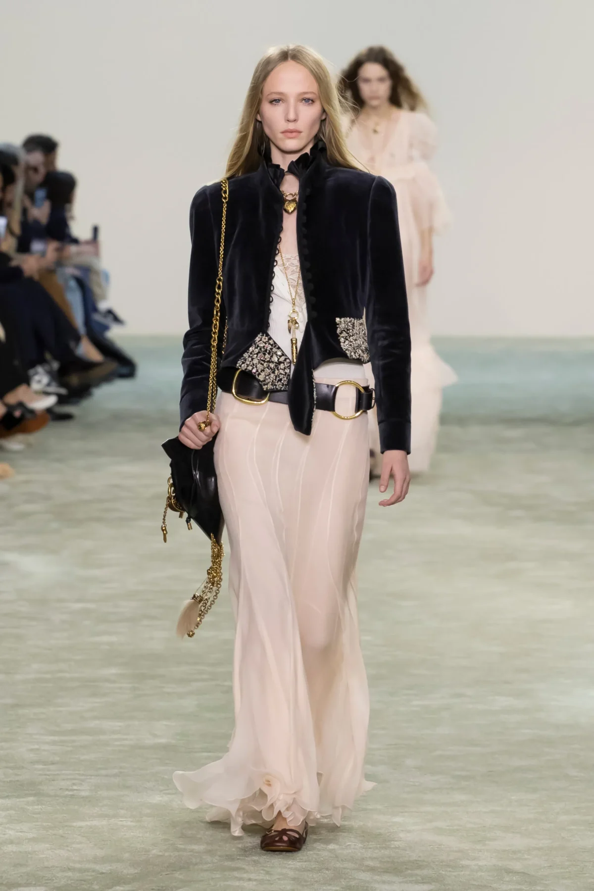 在 Saint Laurent,創意總監 Anthony Vaccarello 打造出帶有印花圖案的輕盈百褶長裙,展現永恆的優雅氣質;Elie Saab 則專注於流動感,以精緻上衣搭配飄逸長裙組成套裝;Chloé 透過輕透的裙擺重現 70 年代波希米亞精神;Blumarine 則以性感開衩造型帶大家回歸令人矚目的千禧年代;而在新任創意總監 Matthieu Blazy 帶來的 Chanel 2026 春夏系列時裝秀上,波希米亞長裙以火焰般鮮紅的層疊設計呈現,展現設計師對鮮明色彩的駕馭能力。