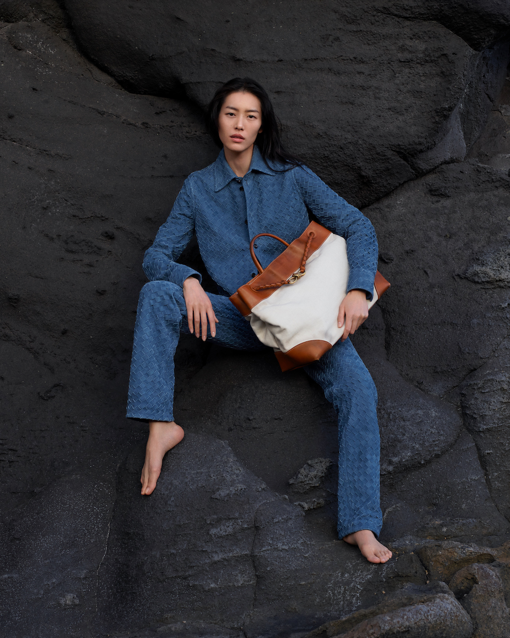 Bottega Veneta 更找來超模劉雯示範新袋,換上一身藍色編織套裝,赤腳坐在礁岩海岸拍攝形象照,散發出一種舒適隨性魅力,完美演繹夏日出行悠閑自在氛圍!