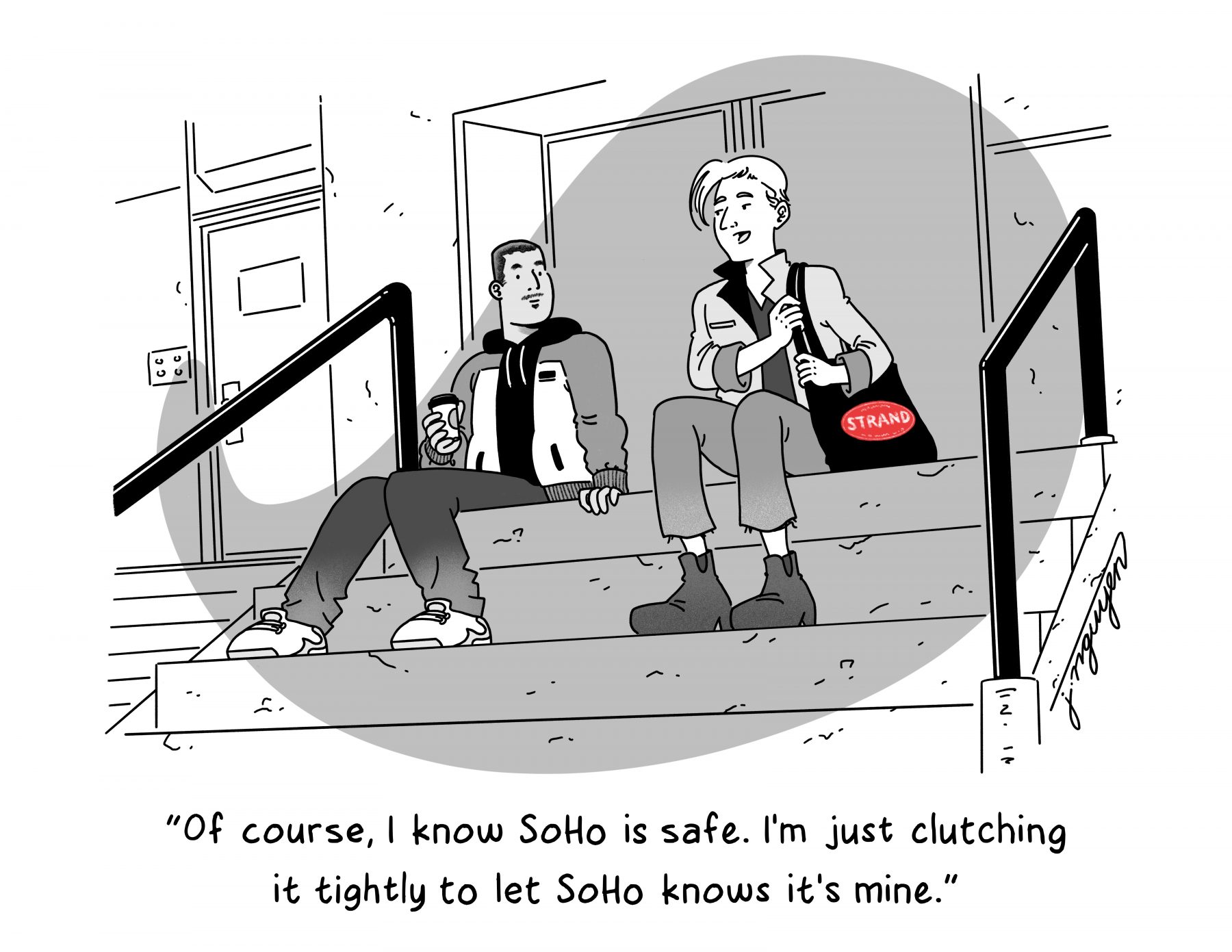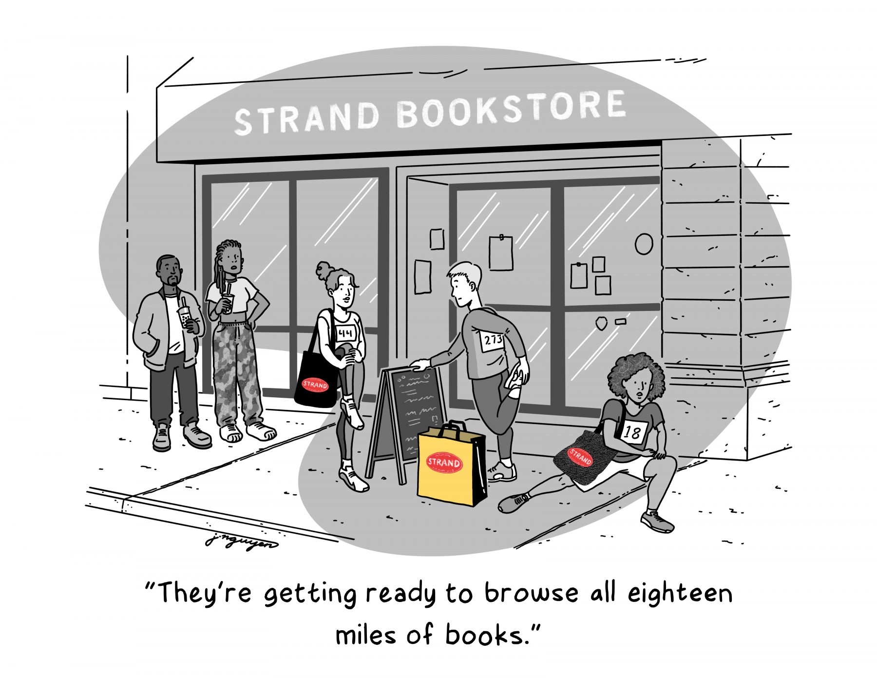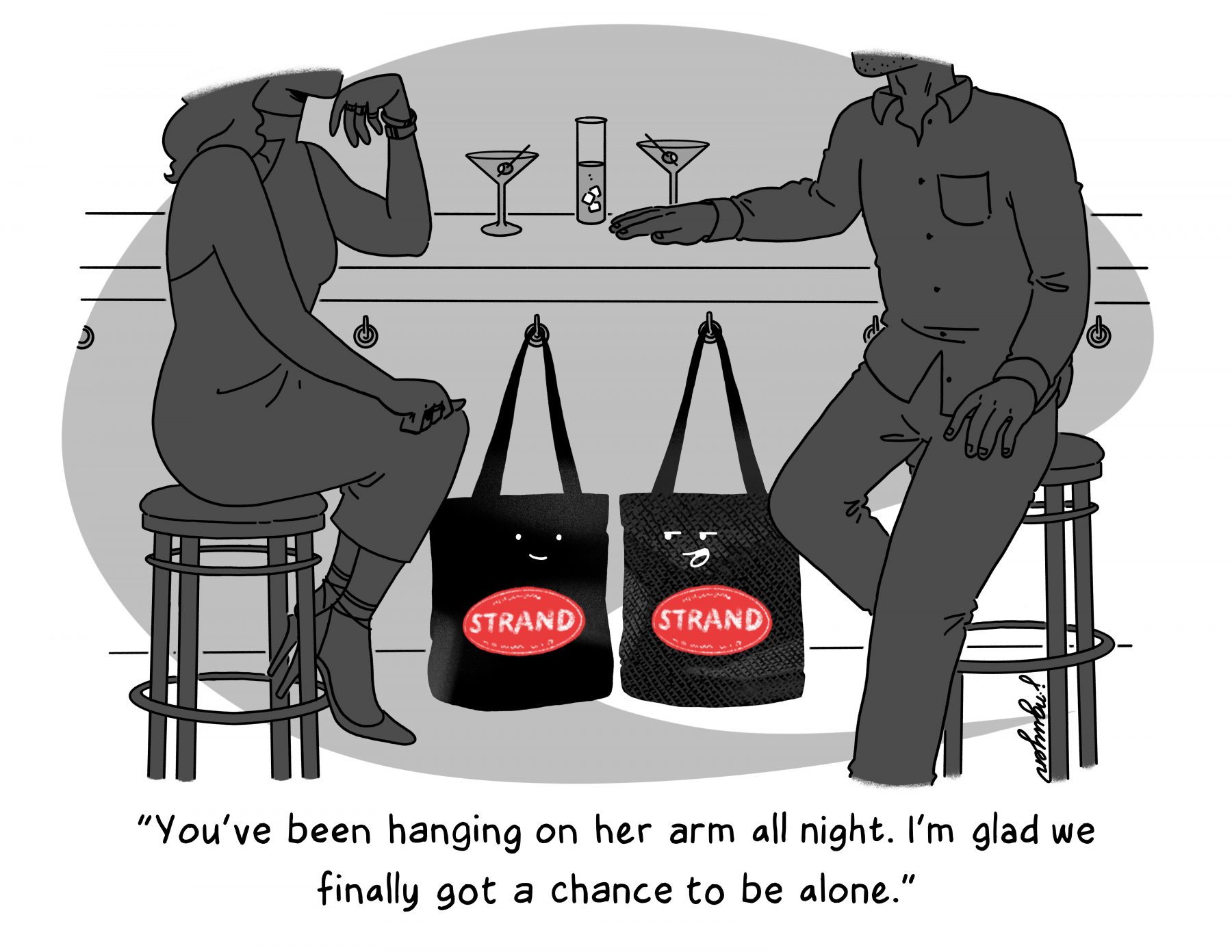 伴隨著手袋的推出,品牌更有一系列特別委託《The New Yorker》的漫畫來紀念這一時刻,5幅饒富趣味的漫畫正好反映 Strand 以及其 tote bag 對文化界的影響力。
