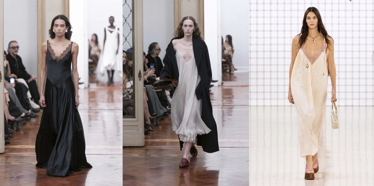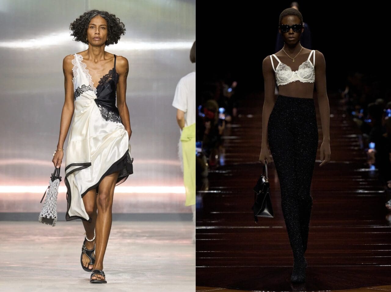 Boudoir可以是一個服裝種類,也能是風格元素。2025春夏時裝騷中,3.1Phillip Lim和Balenciaga分別設計了黑白拼色的緞面而且有喱士裝飾邊的造型,簡約拼色為造型增加一點型格和復古味道,同時保留內衣的私密感。