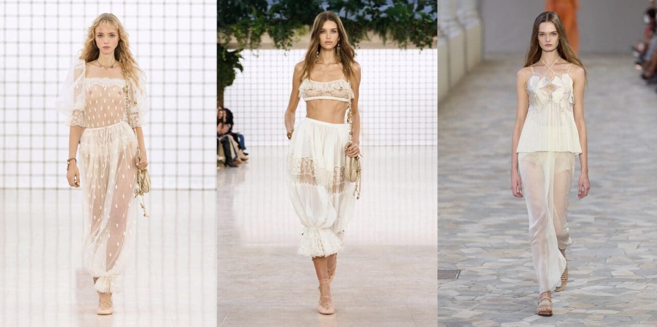 喱士元素也能加進薄紗,效果也不限制於可愛,例如Chloé的設計款式,用白色薄紗設計成吊帶短top和燈籠褲,透視著模特兒的肌膚,大膽前衛同時展現滿滿的民族風。