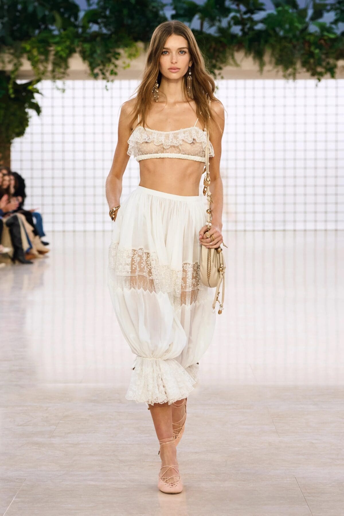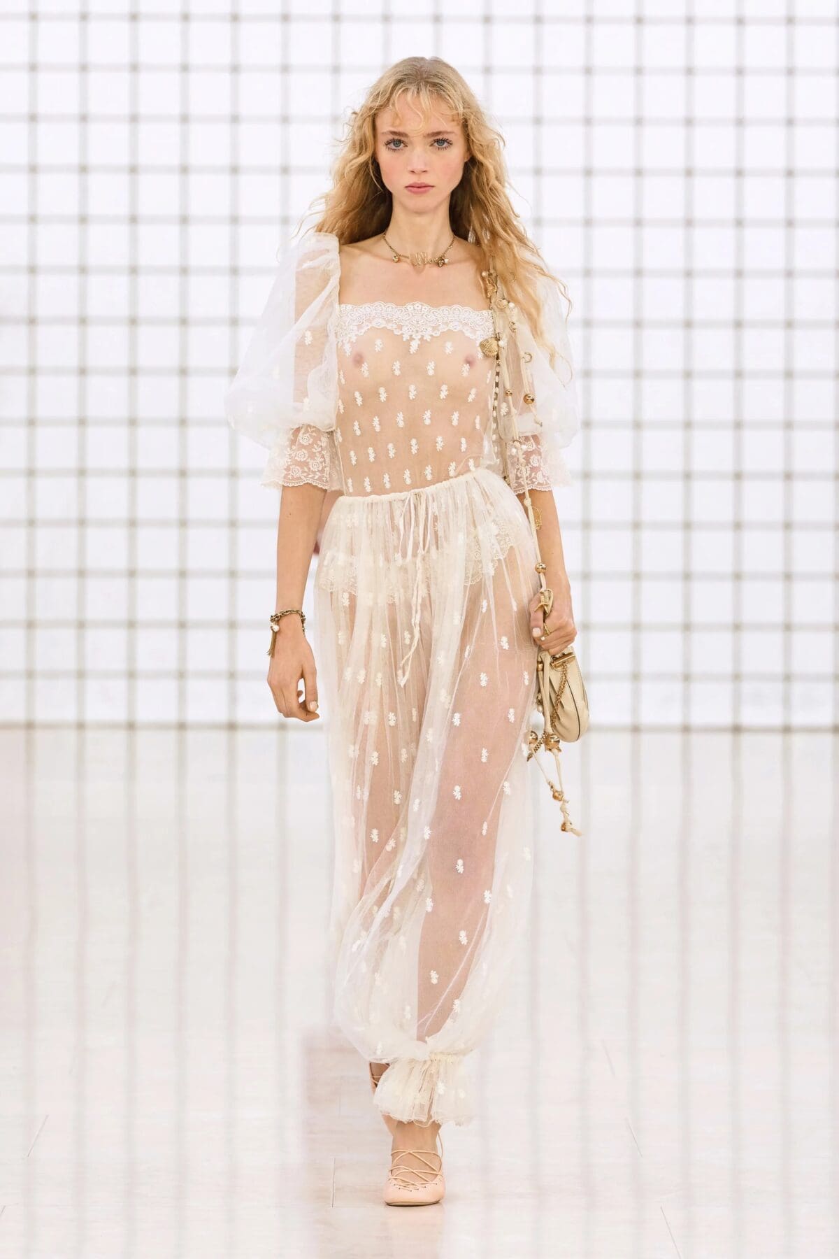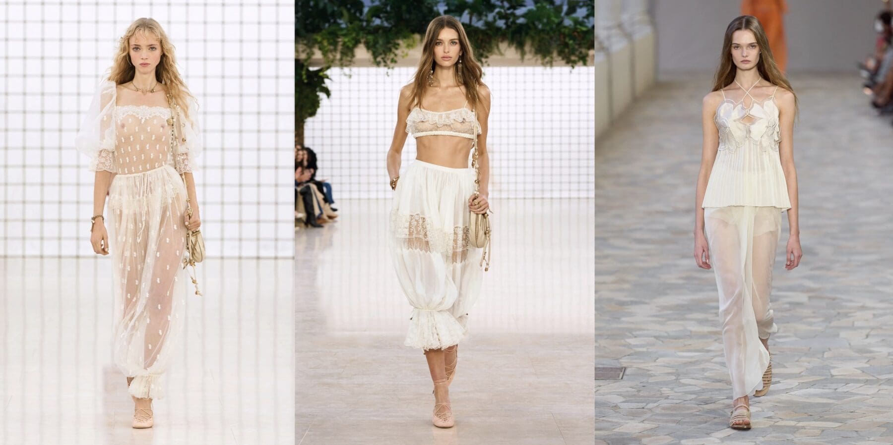 喱士元素也能加進薄紗,效果也不限制於可愛,例如Chloé的設計款式,用白色薄紗設計成吊帶短top和燈籠褲,透視著模特兒的肌膚,大膽前衛同時展現滿滿的民族風。