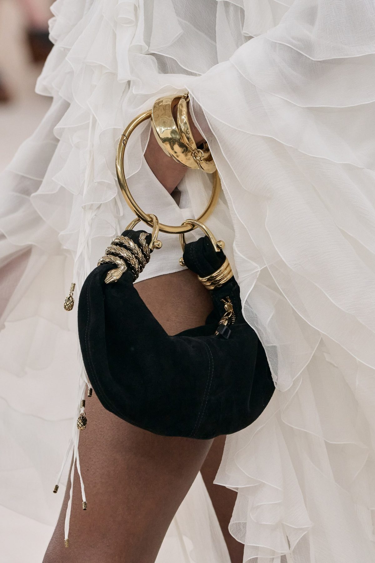 然而,若備受愛戴的英國時尚名人認證都不足以說服你擁抱手鐲包,那就看看 2024 秋冬的另一場精彩時裝展如何再次證明這一珠寶手鐲包的風潮。新任創意總監 Seán McGirr 於 Alexander McQueen 的首個系列上,展示了稜角分明的戒指、手鐲、扣子,而它們都被轉換成了手鐲包。這些型格的五金件為品牌經典的指節套環手袋帶來新鮮感,當時無論 Sarah Burton 盡了多大努力都無法將之變成熱門單品。這次系列的靈感來自俱樂部的年輕人、90 年代的英國標誌性時尚人物——Kate Moss、Amy Winehouse——以及 Lee McQueen 的「The Bird」系列,可見新款配飾有着一定的文化氣息(歡迎 Camden girl 的回歸!)。Burton 的任期內將品牌風格推向貴族而非現實,而就 It-bag 而言,這可能是最接近 McQueen 全盛時期時期的一次。