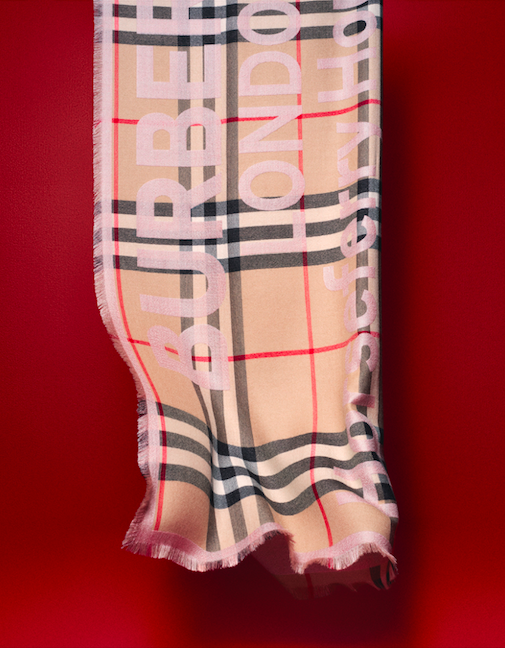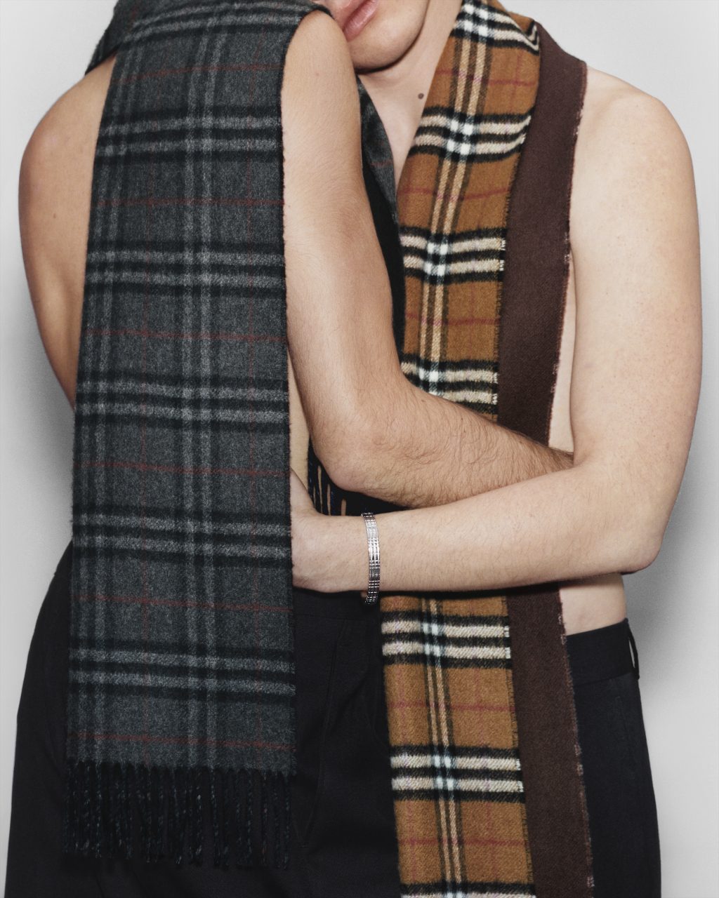 提花精紡喀什米爾印花巾採用經典米色 Burberry 格紋,疊加 Horeseferry 圖案,飾有櫻花圖案。羊毛混紡提花圍由金屬感纖維織就,飾有品牌的徽標。 絲綢巾飾有手繪設計圖案——詮釋 Burberry 典藏 檔案的印花,包含英倫三島地圖以及動物插圖。