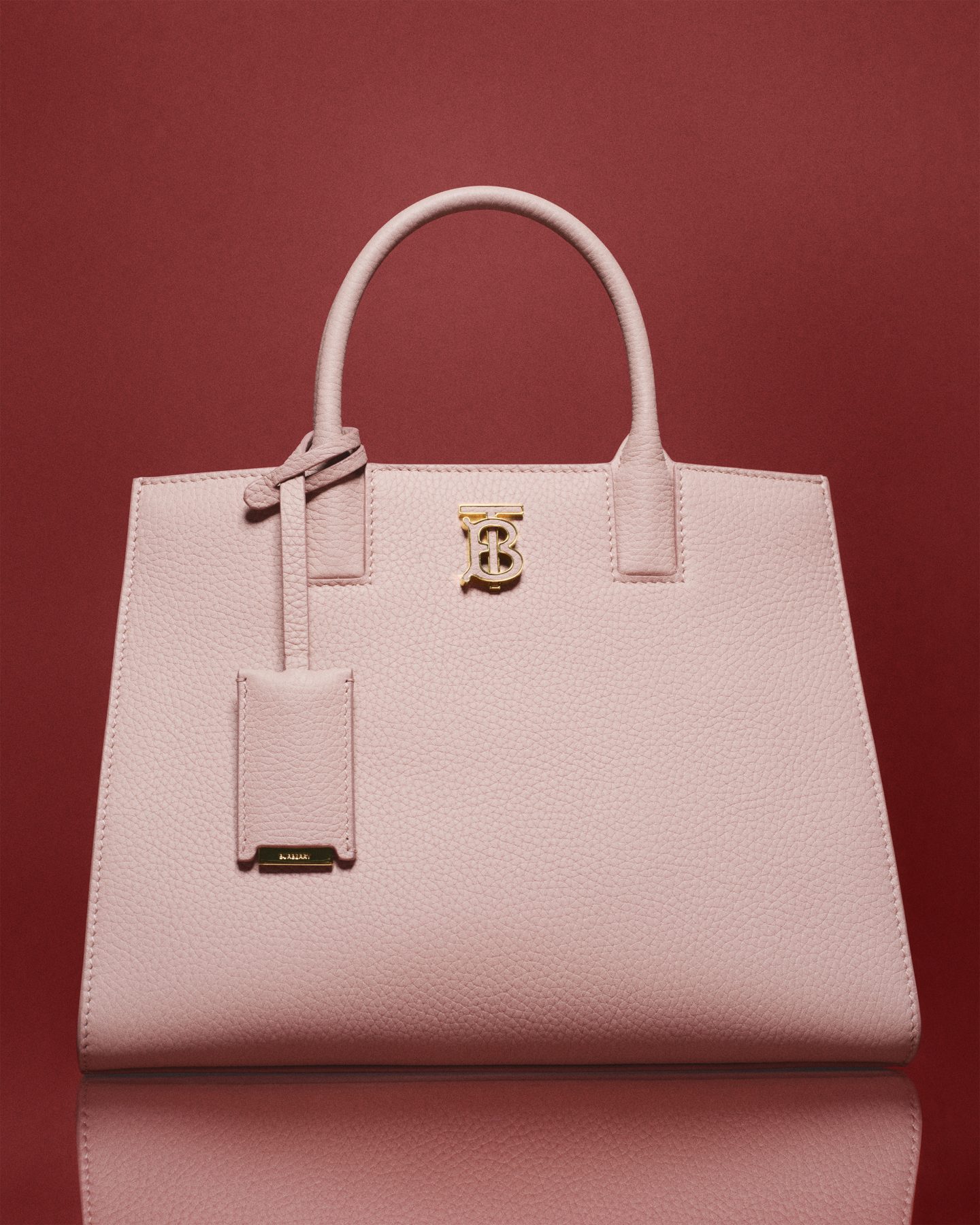 標誌性皮革商品採用黯淡粉紅色和燕麥米色皮革的季節性顏色。設計活潑的柔和硬挺 Lola 系列包款、皮夾和卡片夾,皆飾有標誌性絎縫縫線,以現代化手法 詮釋 Burberry 格紋。 Frances 包和 TB 包的包款設 計簡約且比例簡單,採用粒面皮革製成,飾有皮革鑲嵌的 Thomas Burberry 花押字。 Freya 托特包、 Poket 包和 Note 包等實用包款採用亮紅色雙色調 帆布、飾以黯淡粉紅色皮革製成三種標誌性包款皆 繡有徽標鐫刻飾扣和高對比度的白色 Horeseferry 印花。