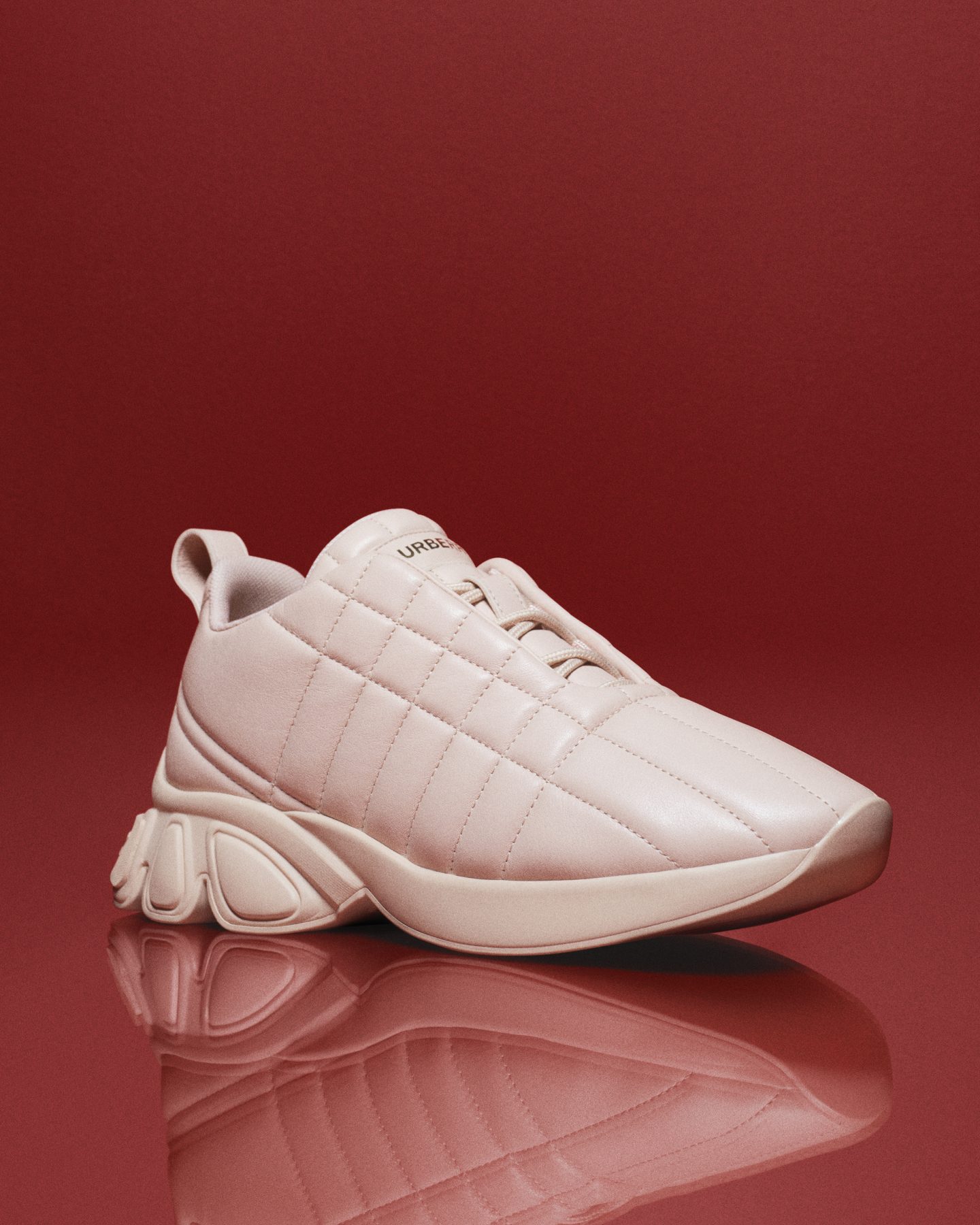 Classic 運動鞋流線型版型,在超輕鞋底上選用絎縫皮革鞋面。相比之下,厚實運動鞋由皮革、麂皮和科技材質混製而成,綴有 Burberry 立體徽標。簡約平底涼鞋和尖頭低跟、細高跟鞋採用黯淡粉紅色皮革, 飾有Thomas Burberry 花押字。
