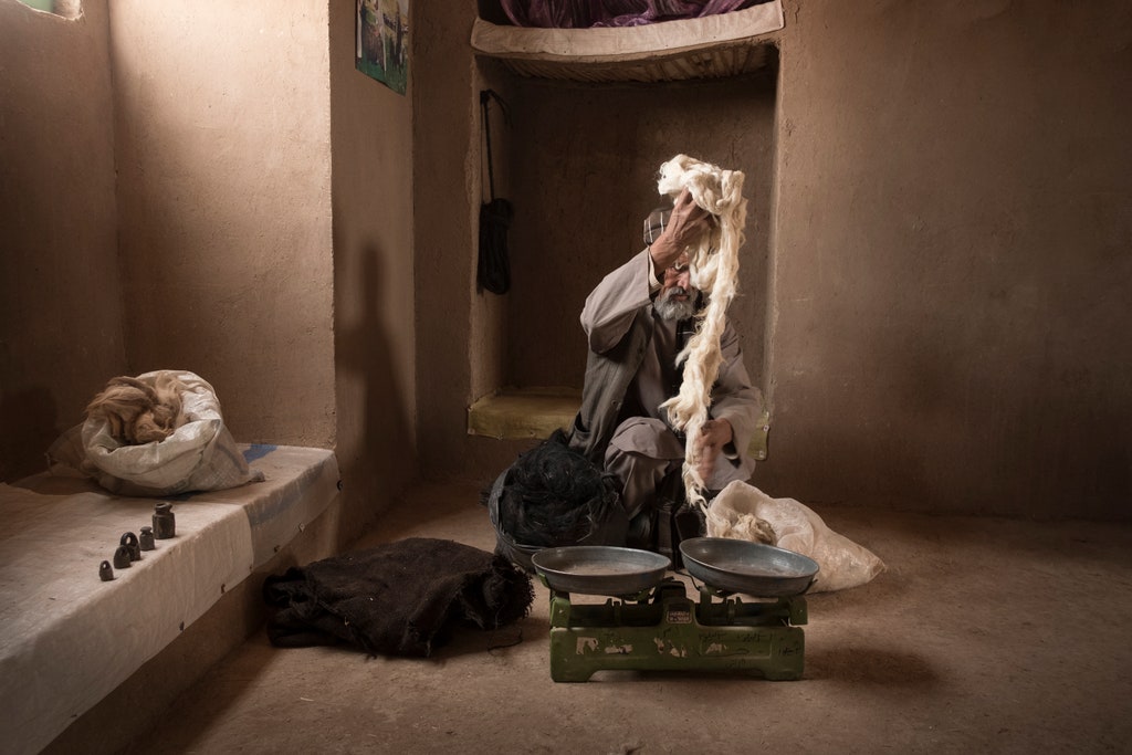 53歲的Ghulam Hazrat在阿富汗卡洛赫區赫拉特的Stop Shop裡量重羊絨。 © Joel van Houdt for Burberry