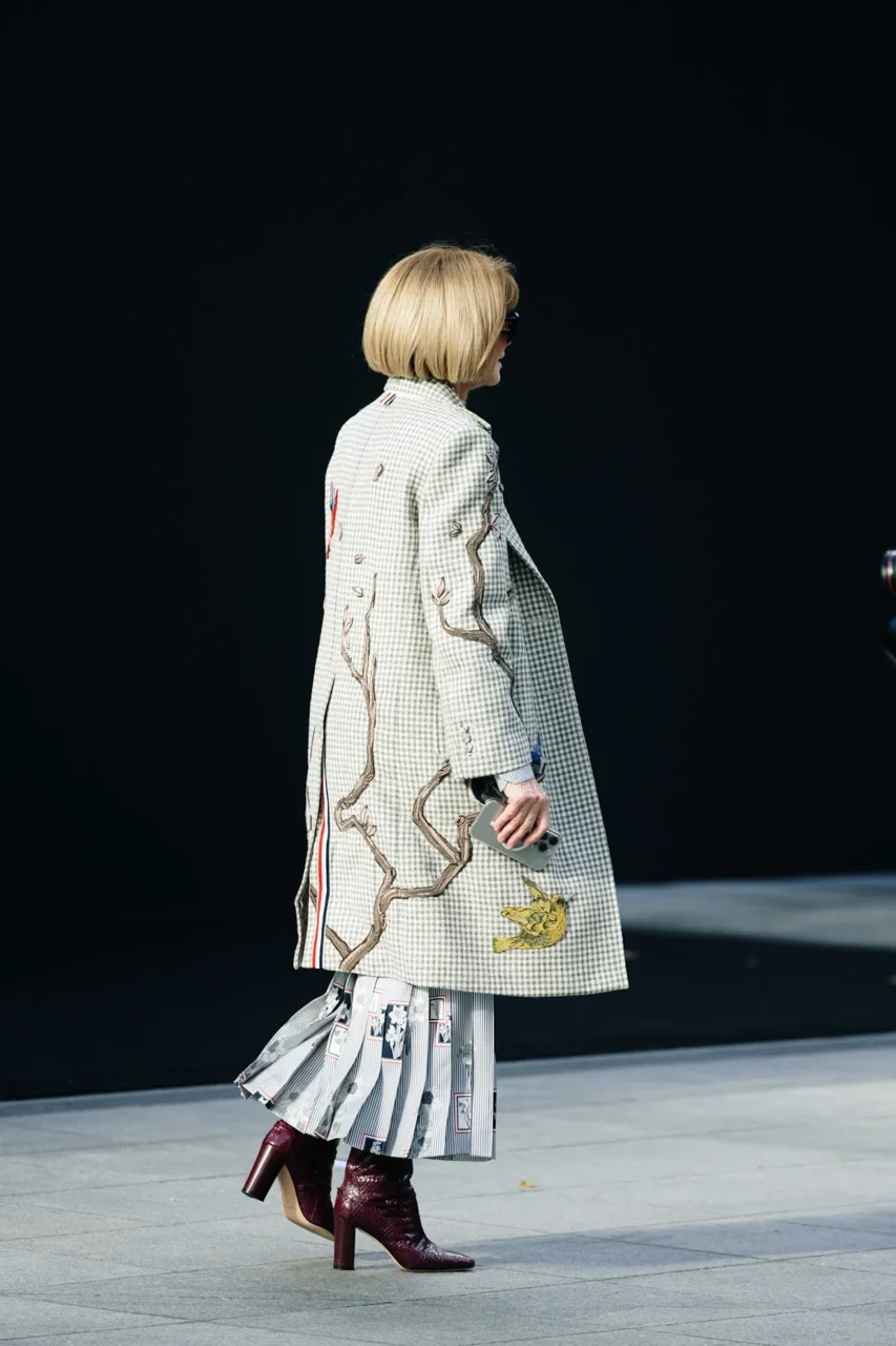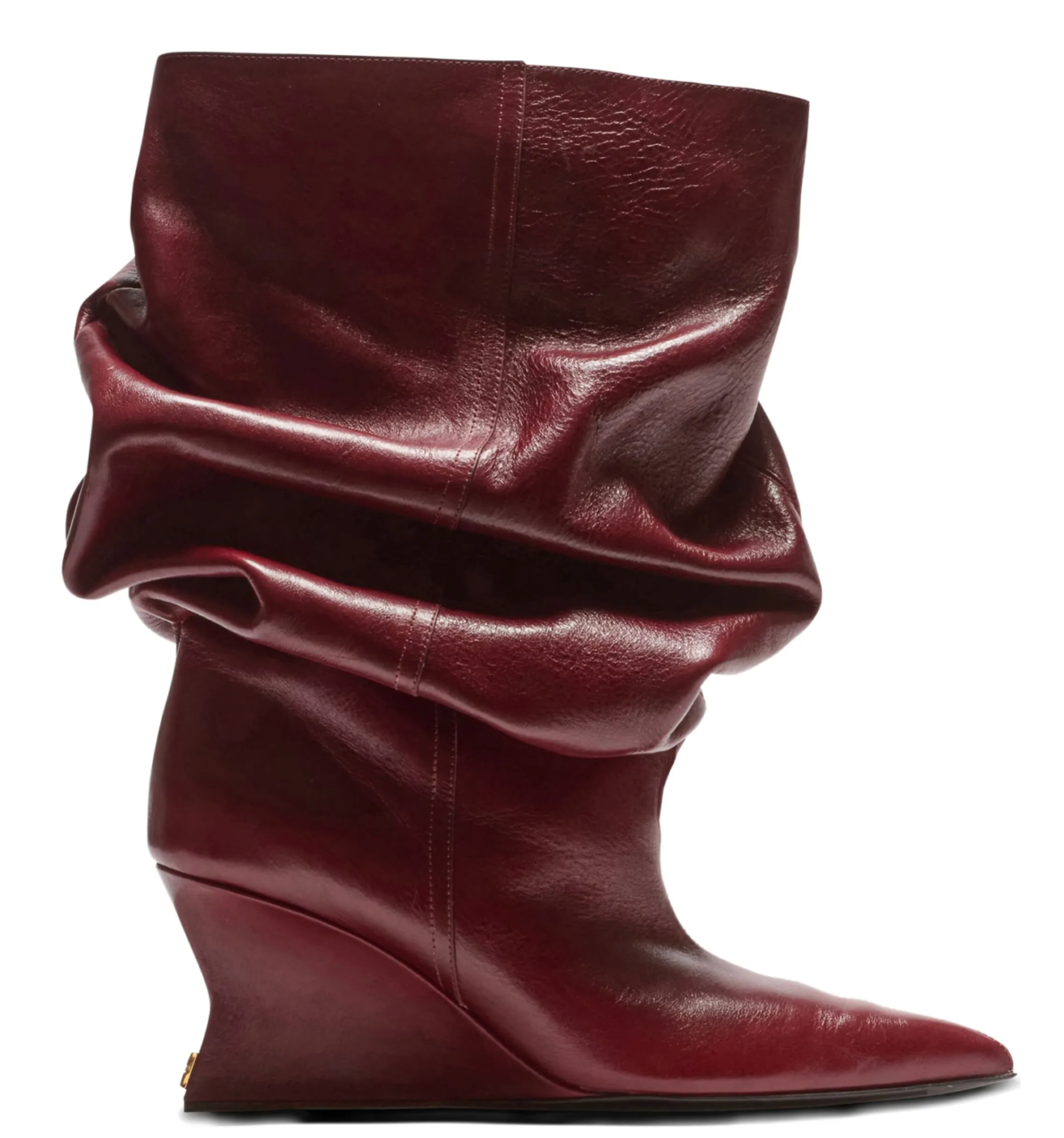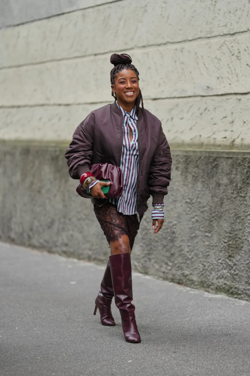 酒紅色靴子正是我們在天橋内外隨處可見的單品。街頭上可見其各種精彩演繹:從亮面漆皮與千禧復古廓形、極具建築感的高跟設計、特色皺褶靴筒搭配褲裝內紮的穿法,到經典短靴款式與精緻的仿蛇皮紋理處理,每一款都展現出獨特的時尚魅力。