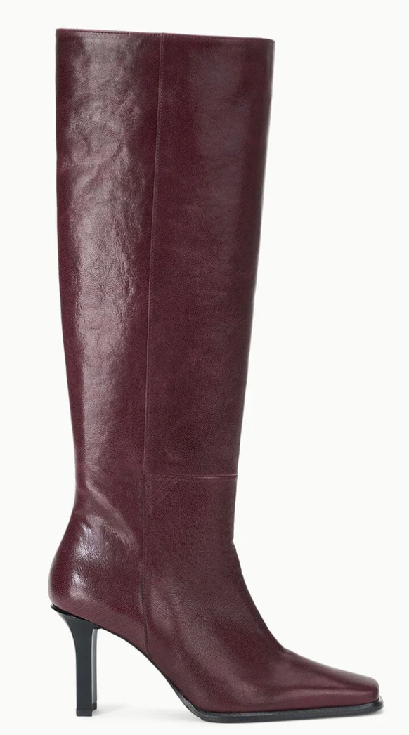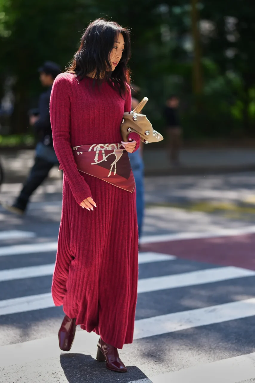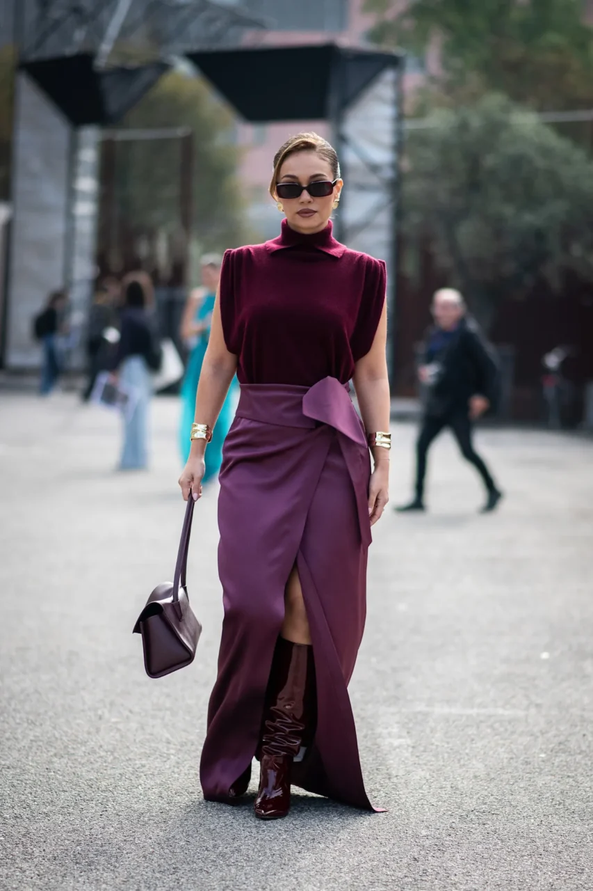 如果選擇想要配搭半身裙,那不妨試試透過其他單品注入酒紅色,無論是選擇無袖上衣、高領毛衣,或是色調稍深的棒球外套,都能達到畫龍點睛的效果。或者,融入當季流行元素,例如搭配浪漫的印花裹身裙或個性十足的流蘇裙,讓酒紅色在行走時從裙擺間若隱若現,營造微妙的時尚感。值得慶幸的是,市面上再度湧現適合各種品味與預算的多元選擇:如果您偏愛百搭實穿款式,在 Staud 或 The Attico 一定能找到符合需求的設計;而鍾情高跟設計的時尚愛好者,則可在 Bershka 或 Balmain 發掘高低靴筒的各色精彩設計。