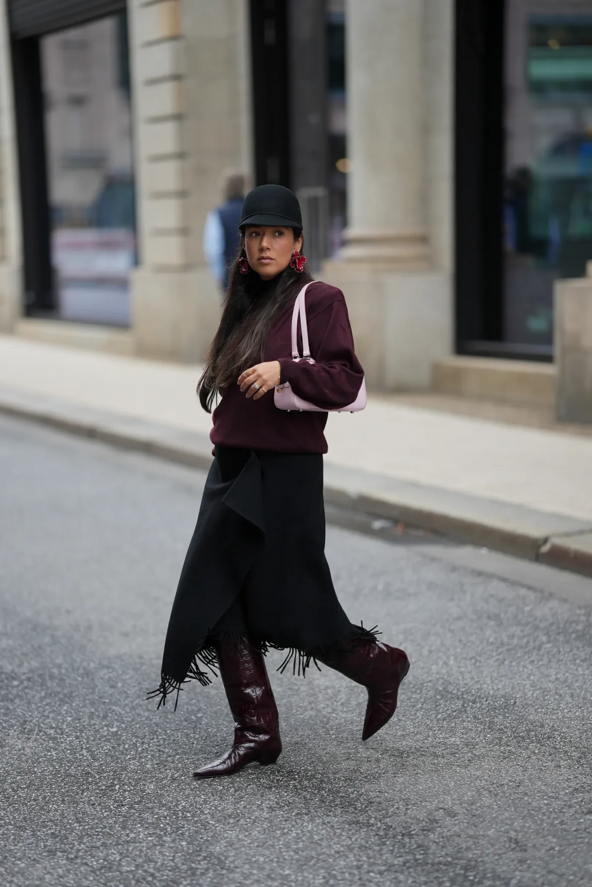 如果選擇想要配搭半身裙,那不妨試試透過其他單品注入酒紅色,無論是選擇無袖上衣、高領毛衣,或是色調稍深的棒球外套,都能達到畫龍點睛的效果。或者,融入當季流行元素,例如搭配浪漫的印花裹身裙或個性十足的流蘇裙,讓酒紅色在行走時從裙擺間若隱若現,營造微妙的時尚感。值得慶幸的是,市面上再度湧現適合各種品味與預算的多元選擇:如果您偏愛百搭實穿款式,在 Staud 或 The Attico 一定能找到符合需求的設計;而鍾情高跟設計的時尚愛好者,則可在 Bershka 或 Balmain 發掘高低靴筒的各色精彩設計。