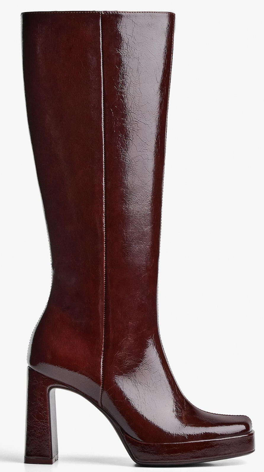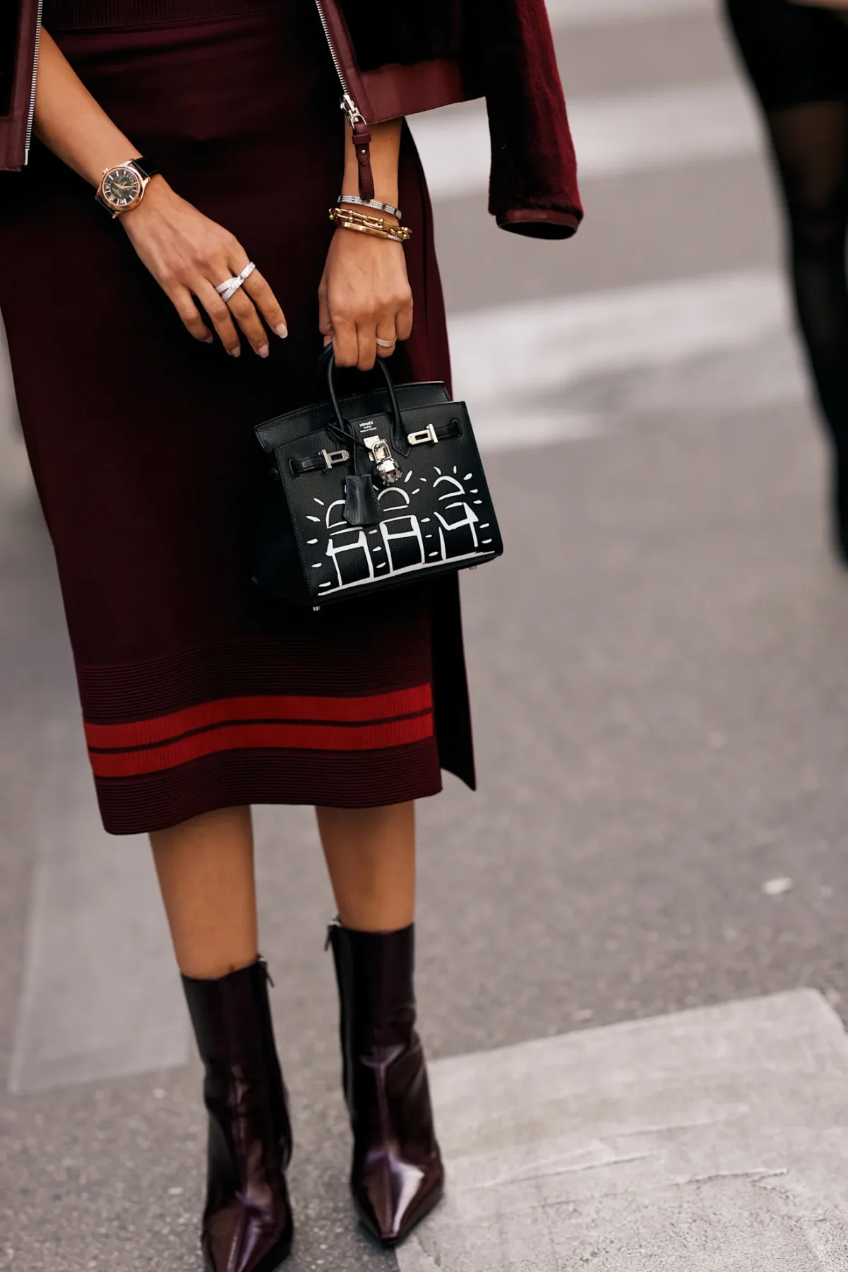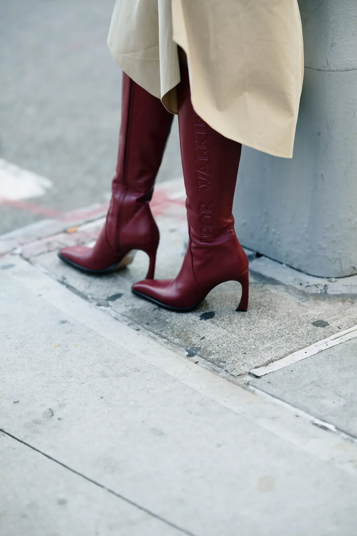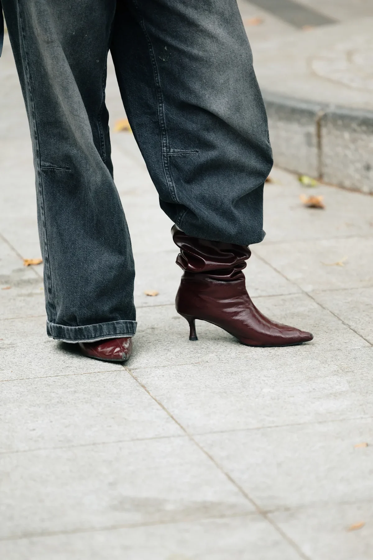 酒紅色靴子正是我們在天橋内外隨處可見的單品。街頭上可見其各種精彩演繹:從亮面漆皮與千禧復古廓形、極具建築感的高跟設計、特色皺褶靴筒搭配褲裝內紮的穿法,到經典短靴款式與精緻的仿蛇皮紋理處理,每一款都展現出獨特的時尚魅力。