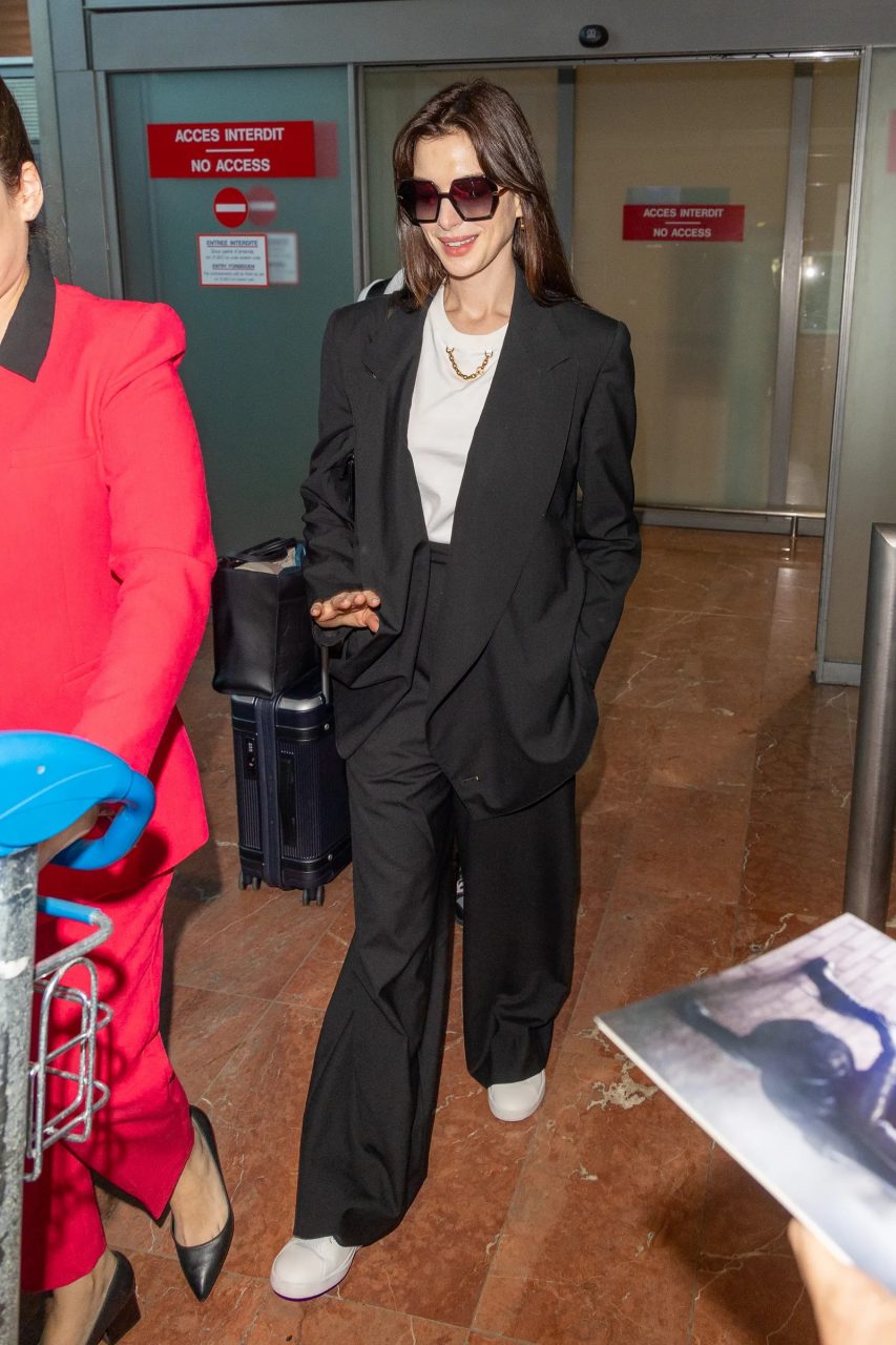 再一次,穿寬鬆的西裝從不會出錯。Anne Hathaway 用一件白色 T -shirt 和運動鞋減少了這對量身定制組合的正式感。