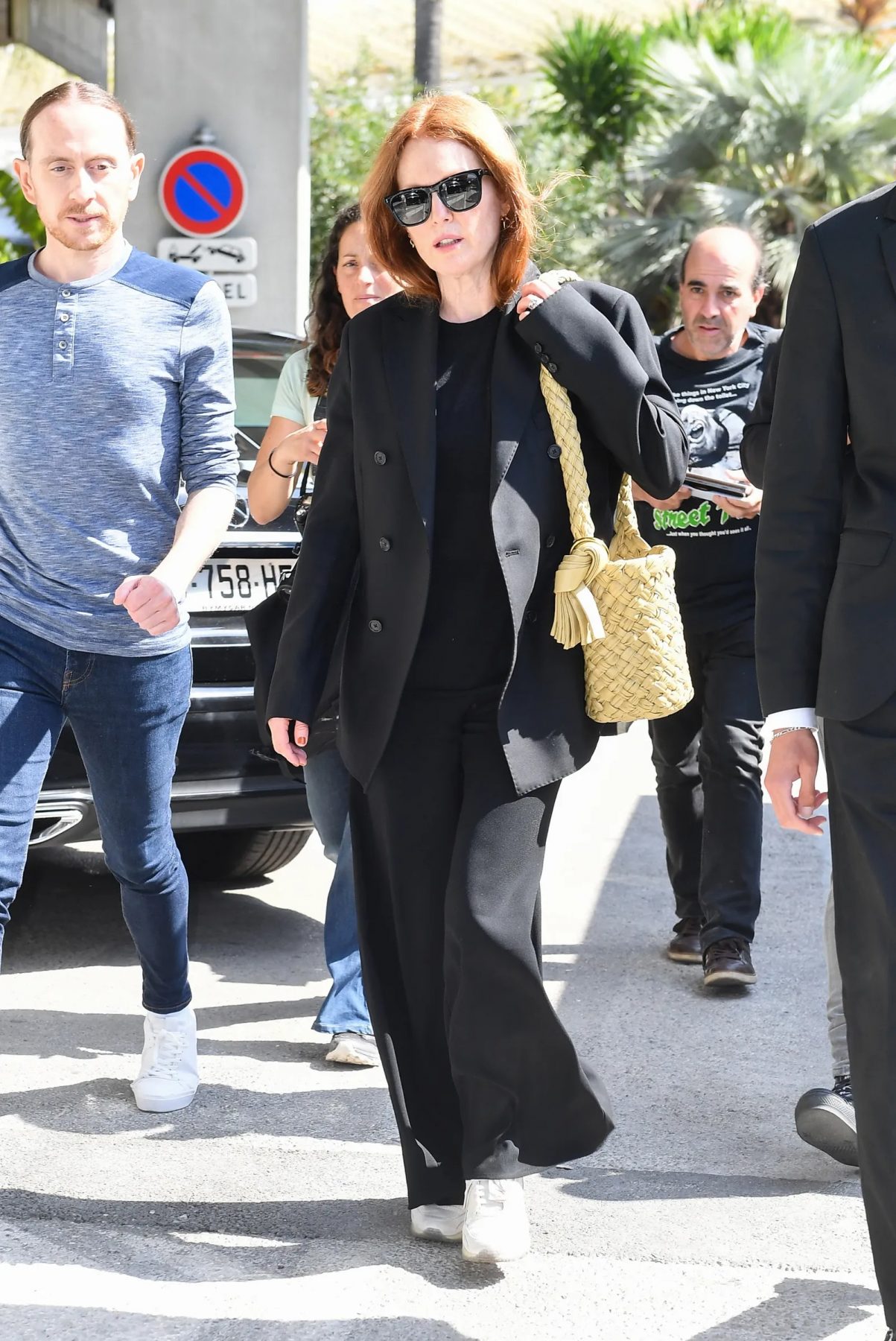 像影后 Julianne Moore 以一套舒適而寬大的黑色西裝,搭配 Nike 運動鞋,以及贏得機場造型的秘訣——一個出色的手袋,帶來了一星光熠熠的旅行造型。Moore 挑選了一款奶油色,由 Bottega Veneta 打造的完美夏季編織水桶袋。