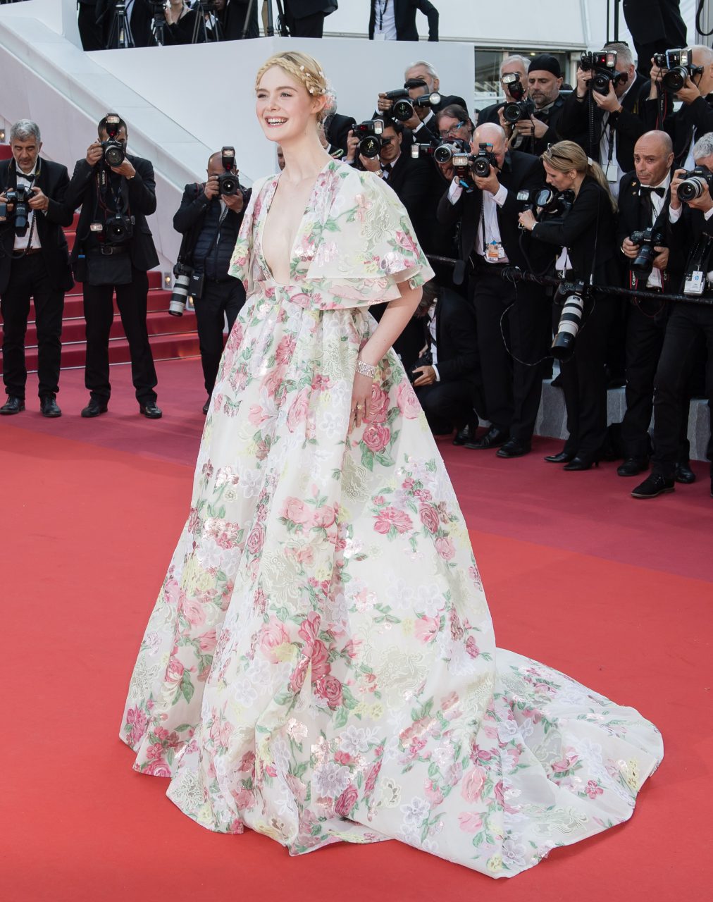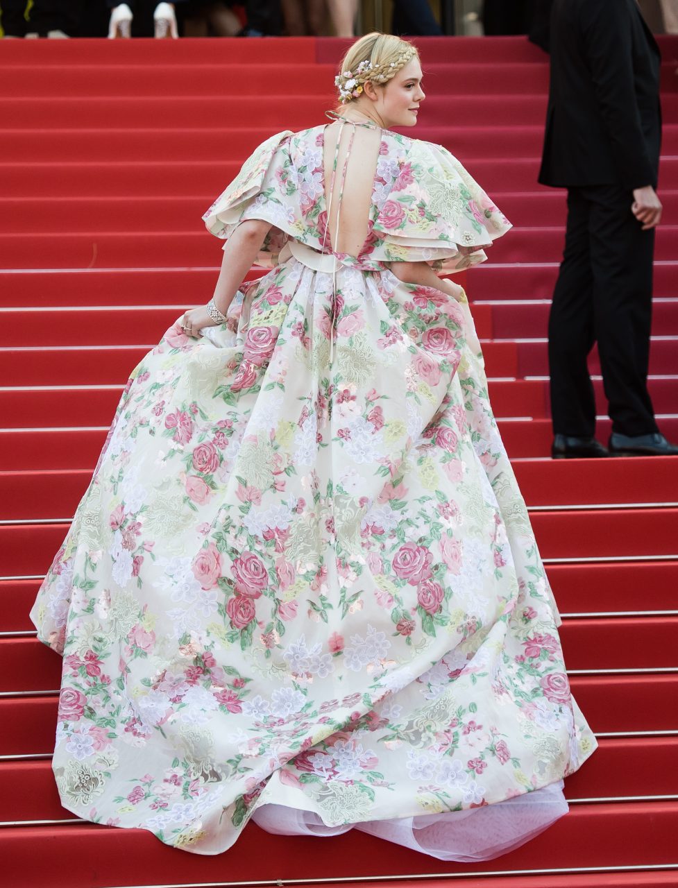另一位則是年紀輕輕的Elle Fanning,由第一集贏得票房和好口碑的《黑魔后:沈睡魔咒》(Malnificent)的她在出演今年上映的第二集。平時在紅毯上都以甜美少女形象示人的人在康城帶來了更為高調又驚艷的造型。更有言Elle是今屆康城紅毯上的「MVP」。的確,小露性感是長大的宣言,那麼服裝的色彩與妝髮卻保留了可以一路甜美親民的形象,加上她頻繁露出大大咧咧的笑容,為康城帶來了愉悅的氣氛。第一日在康城影展開幕儀式和“The Dead Don’t Die”的首映禮上穿著Gucci披風禮服;第二日在”Les Miserables”的首映禮上,Elle Fanning身穿Valentino的高級訂製碎花禮服,加上穿插在髮髻間的花朵,儼如清新Princess Aurora本人,仍然是眾星的焦點。