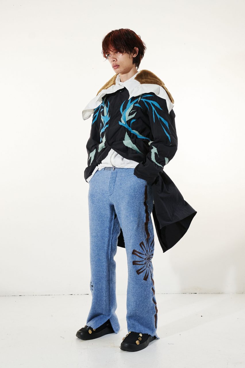 「這場展示是基於葡萄牙的冬至儀式。我將這個異教傳統和圍繞着性別的法,加入我對高級時裝、手工和機械工藝、開衩裙、Zoom 虛擬北京等興趣混合在一起。」