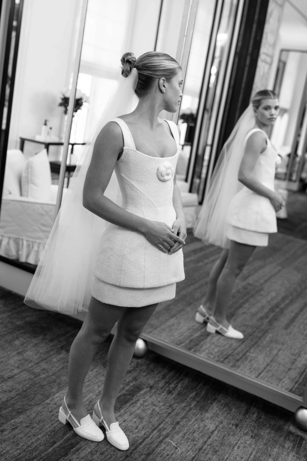 Sofia Richie 也可以保證 Chanel 鞋履的舒適度。這位新娘在 Antibes 的 Hotel du Cap-Eden-Roc 舉行的禮後派對上,從蕾絲禮服換上了雕塑般的香奈兒迷你裙——靈感來自 Claudia Schiffer在天橋上穿的那套經典新娘裝。她穿著閃亮的白色露踭loafers 完成了她的派對裝扮,這雙樂福鞋讓她度過了漫長晚上。按照 Richie 自己的說法,她穿着它「一直派對直太陽升起」。