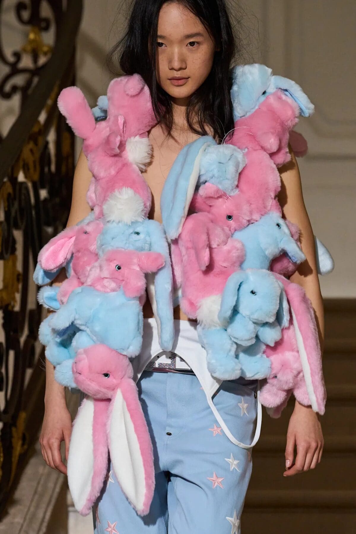 Kenzo則選擇以童年記憶中的毛絨玩具為靈感,推出一系列結合了「Dolled Up」潮流的設計。根據Pinterest的數據,「Dolled Up」是2025年的熱門趨勢之一,以90年代兒童文化(如Polly Pocket美學和Cutecore)為靈感,藉由諸如David Koma為Blumarine呈現的現代化演繹。