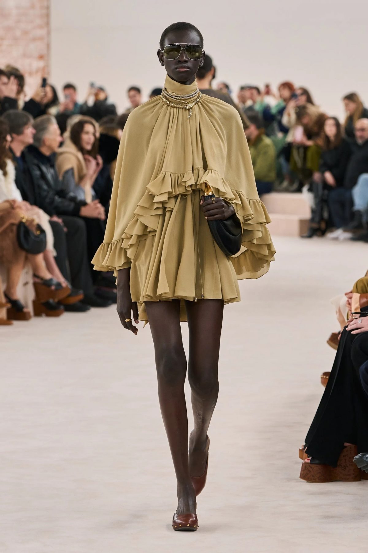 因此,我們正在見證 20世紀 70 年代末Chloé的回歸。Chloé 是自然、感性、強大且輕鬆的女性氣質的代名詞,在時裝展場場上,除了像經重新設計的牛仔布和皮革喇叭褲,或粉米色到松綠等有機色調,以至各種透視輕盈單品外,新系列還在配飾方面呈現了令人渴望的新單品——這就是Chloé 全新袋款 Bracelet。