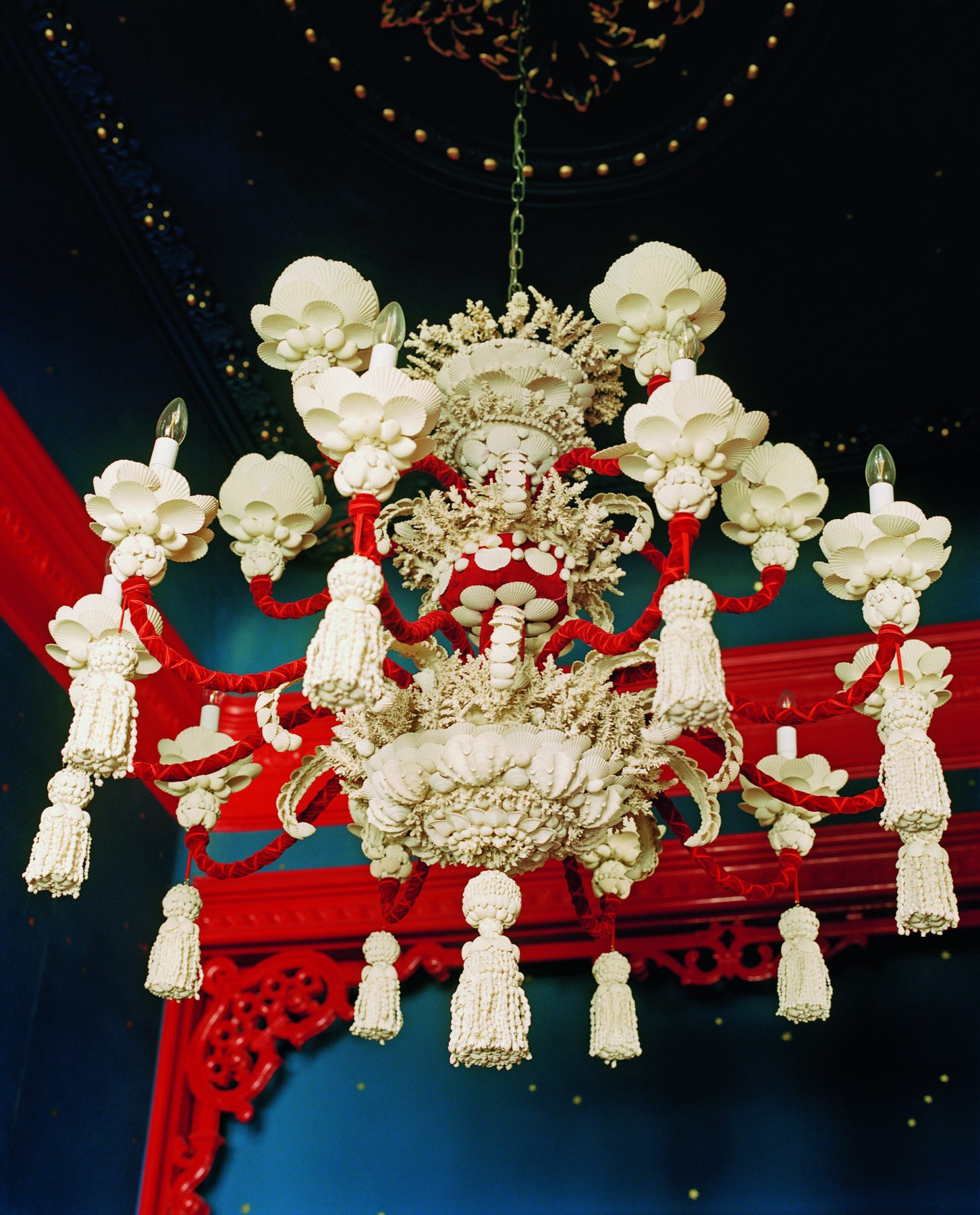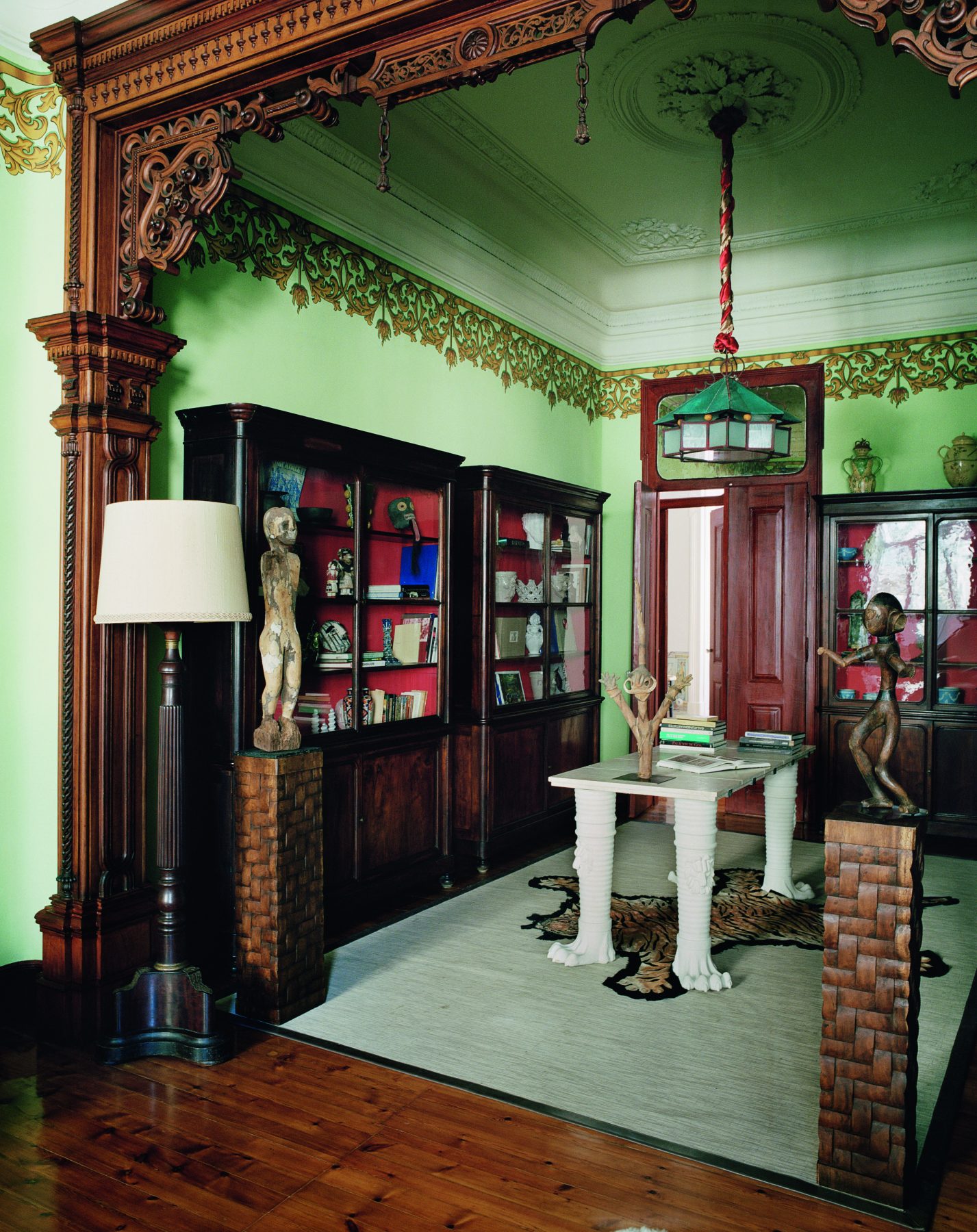 大宅美得叫人屏息,推門進來,首入眼簾是宏偉的樓梯,牆壁上是保加利亞藝術家Boris Deltchev的熱帶雨林手繪畫。燈光流竄於窗邊,照亮了有如珠寶一般的玻璃,即使在最遠的角落,寶石般的葉子,也栩栩如生,躍躍欲現,光芒萬丈,叫人想起老宅舊牆壁的痕跡。浴室,仍然以瓷磚覆蓋,修復過的絲絨梳妝椅,還有兩個充滿古靈精怪物件的櫃子:新畿內亞Maprik的部族婚姻令牌丶一系列藍白色的中國瓷器丶紙造的蜥蝪藝術品、兩張購自巴黎的印度及葡萄牙式的椅子,「這是派對之室。」他最近就為時裝新聞工作者Suzy Menkes,舉行了一場80人的燭光晚宴,「那些燭光實在太熱,我們需要把窗門都全開。」