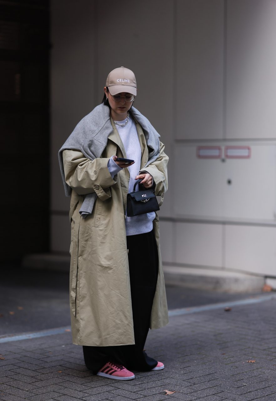 COLOGNE, GERMANY - SEPTEMBER 25: Maria Barteczko seen wearing a khaki green oversized trenchcoat by NA-KD, an ARKET wool sweater over the shoulders, a grey oversized ARKET sweater, a black silk wide ARKET leg pants, a Celine beige logo baseball cap, Adidas pink Gazelle sneaker, H&M silver necklace, H&M silver hoop earrings, Hermès black leather mini Kelly bag and Ray-Ban gold round retro glasses on September 25, 2022 in Cologne, Germany. (Photo by Jeremy Moeller/Getty Images)