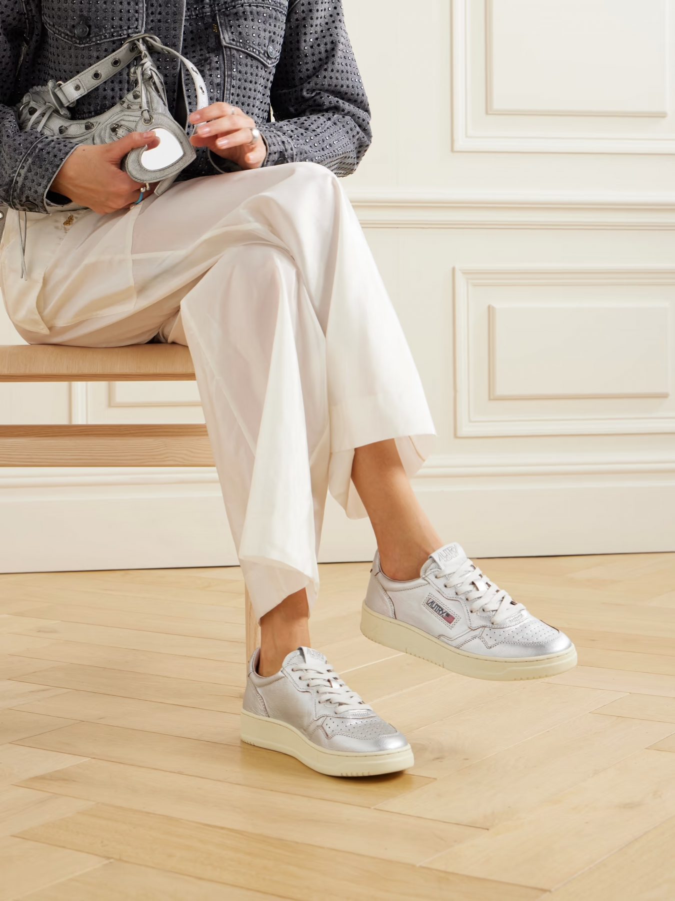 今年許多品牌都推出了金屬風格的款式,有單用銀色來營造金屬氛圍的,有些鞋款則會在鞋身增加一些讓整個鞋子更加閃亮的材質。比如Autry Medalist的Metallic Leather運動鞋就以銀色為主基調,Bottega Veneta Orbit運動鞋也有推出利用閃亮元素打造重金屬感的鞋款。Wales Bonner的重金屬風格運動鞋則將未來主義混合。