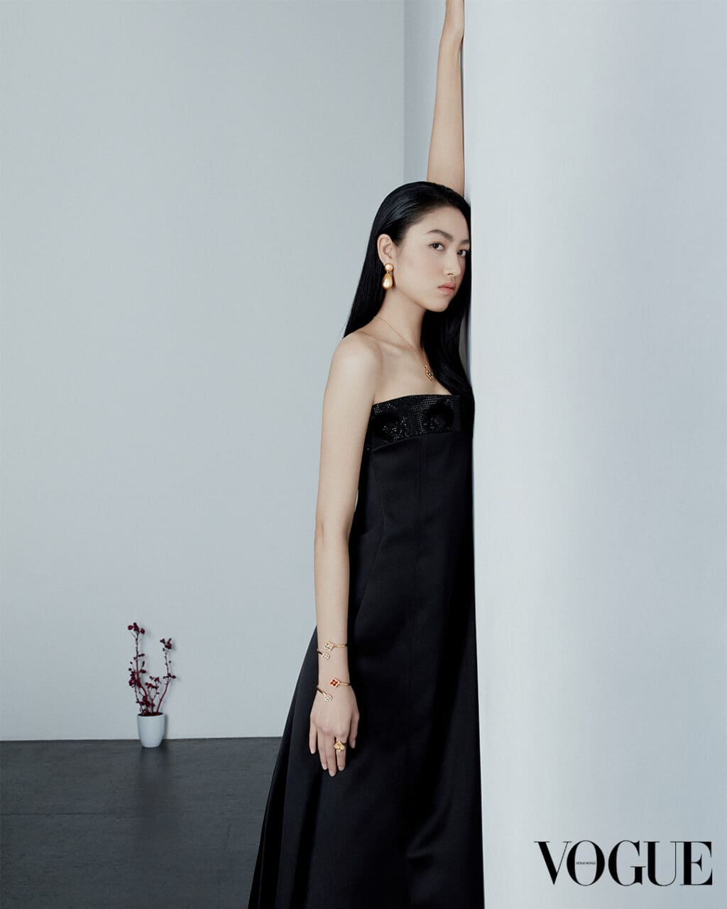 Dress, Giorgio Armani. Macri Classica yellow and white gold earring, Opera Tulle yellow and white gold pendant necklace, bracelets and ring, all Buccellati.
