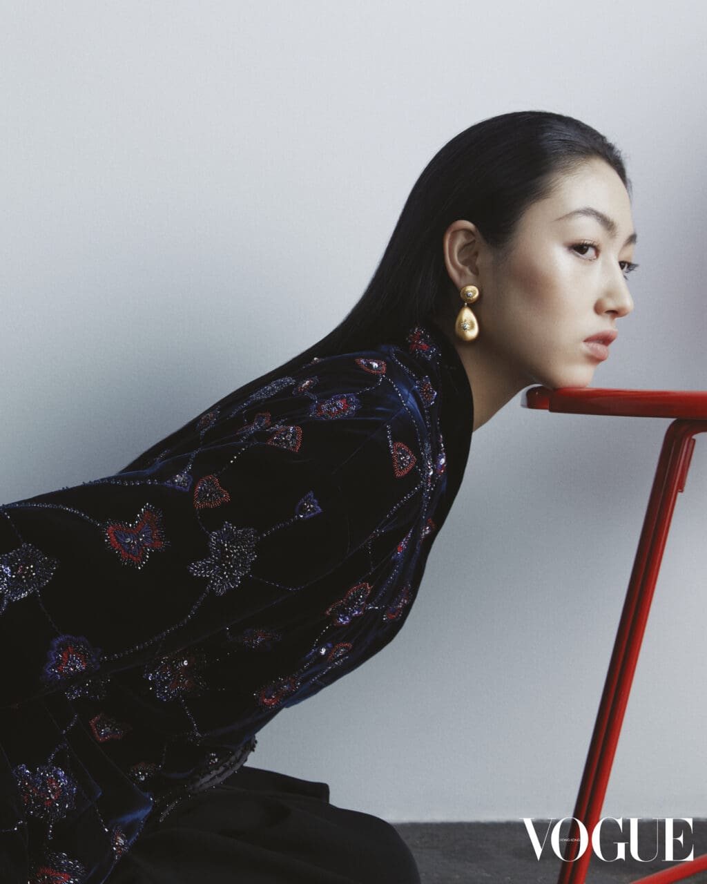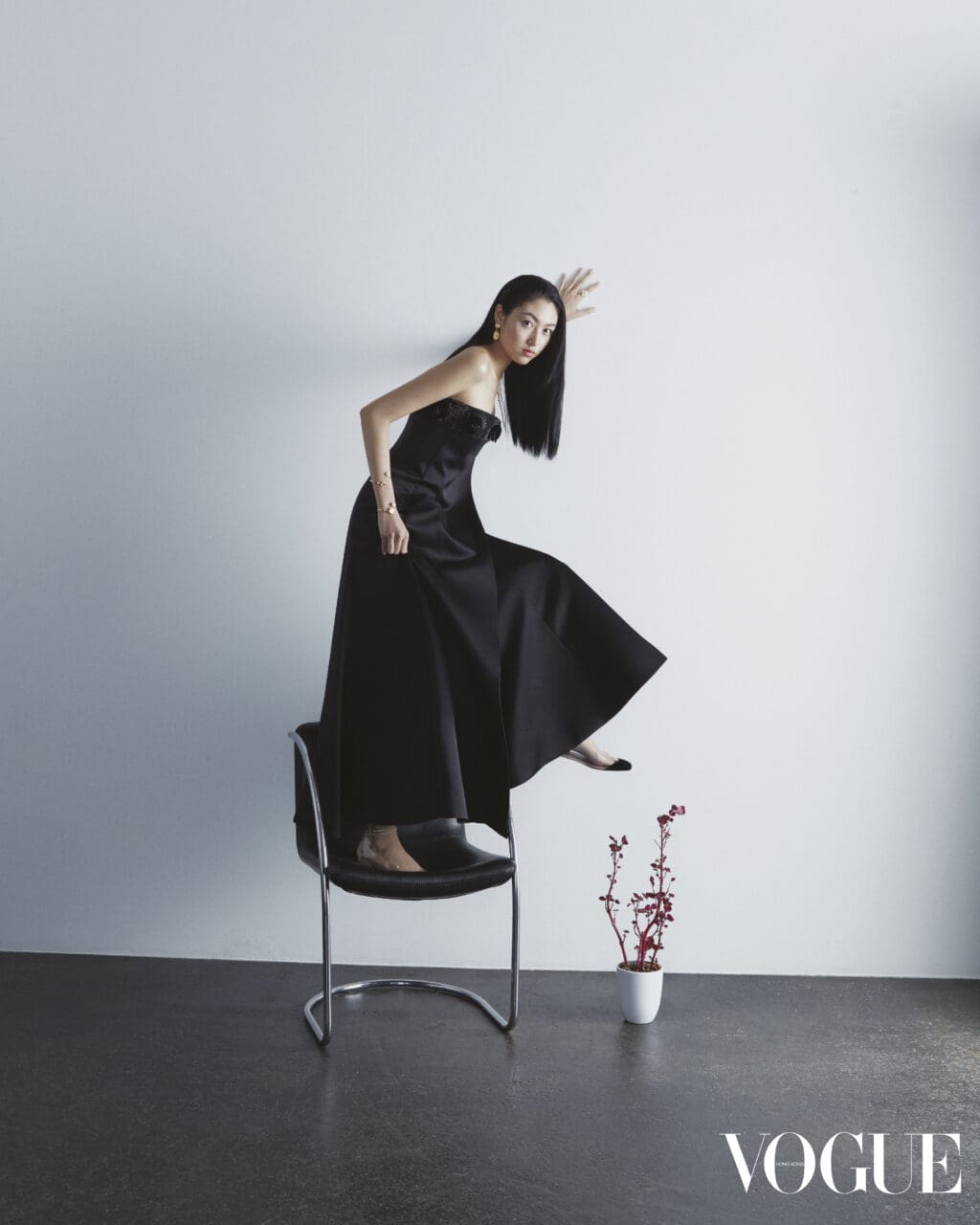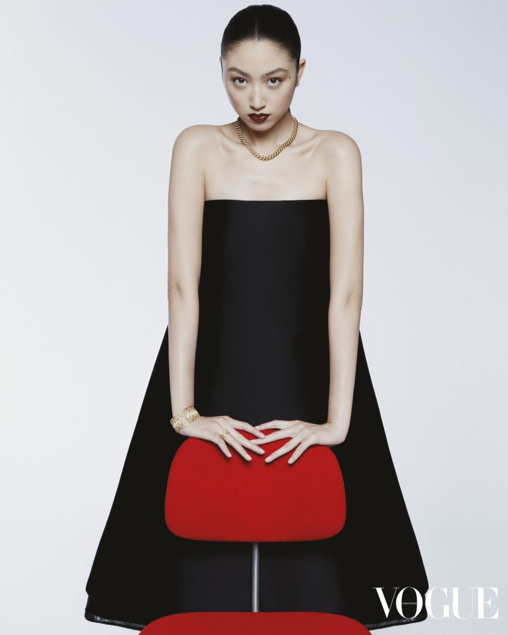 再次登上封面,對我而言是一份極大的榮幸與感激。我剛剛告訴我母親,這對我來說是一個充滿意義的時刻。當我14歲時拍攝了第一次的《VOGUE》Hong Kong封面,如今我已經19歲,我學習了許多,改變了許多,積累了豐富的人生經驗,這些經驗塑造了今日全新的我。看着這兩次拍攝的照片,彷彿看到了自己成長的影子。其中一個最難忘的時刻是在一把形狀奇特、不穩定的椅子上拍攝。我身穿一襲巨大的裙子,站在椅子上單腳站立,踮着腳尖,另一腿伸出。保持平衡非常具挑戰性,但我對自己說:「無論如何,我必須做到,無論要拍多少次、拍多久,我都要做到最好。」
