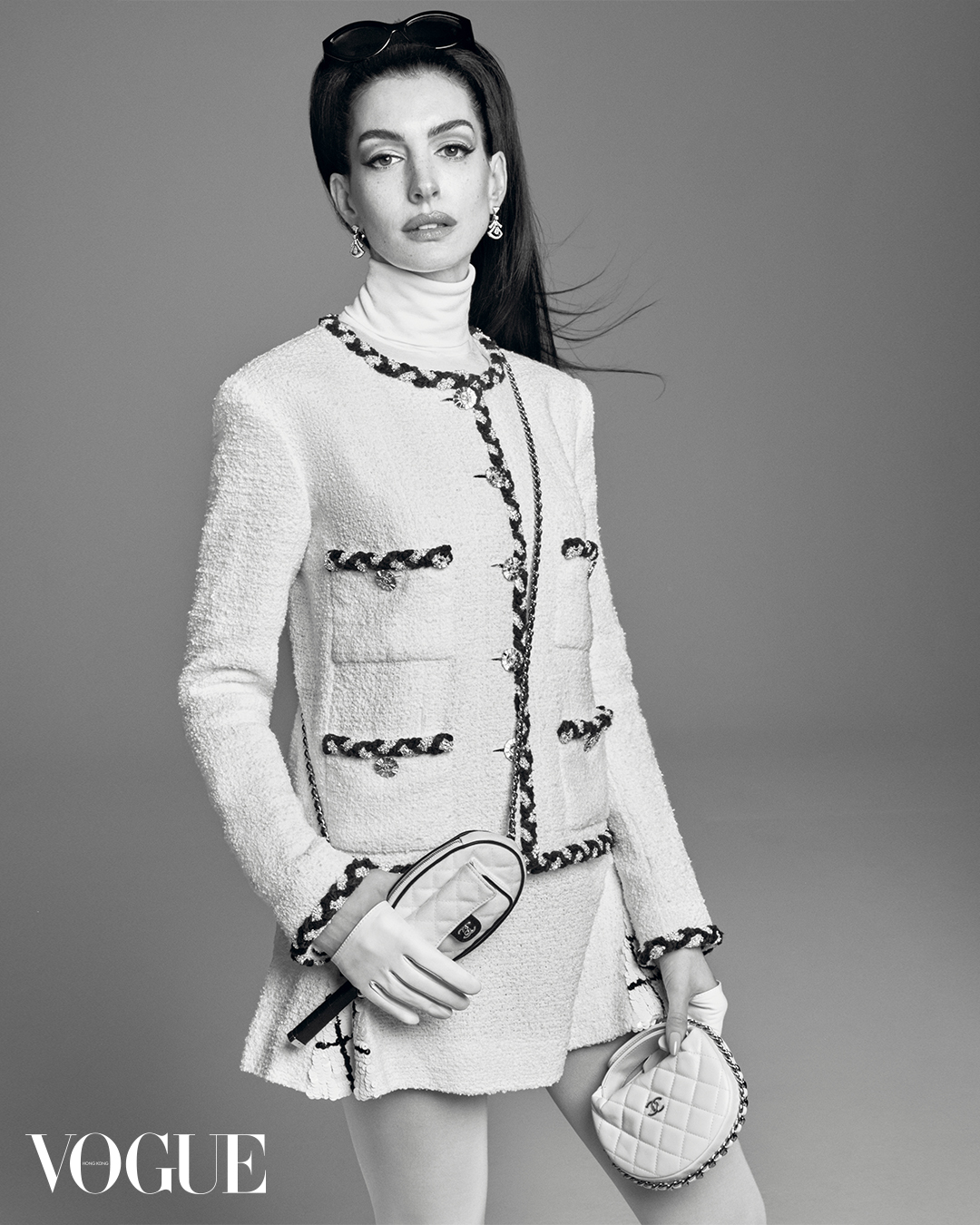 Jacket, skirt, sunglasses and bags, all Chanel. Top and tights, all Wolford. Gloves, Paula Rowan. Divas' Dream High Jewellery earrings in white gold with 2 pear emeralds (1.85 ct), 24 buff top emeralds (1.12 ct), 2 round brilliant cut diamonds and pavé set diamonds (1.92 ct), BVLGARI.