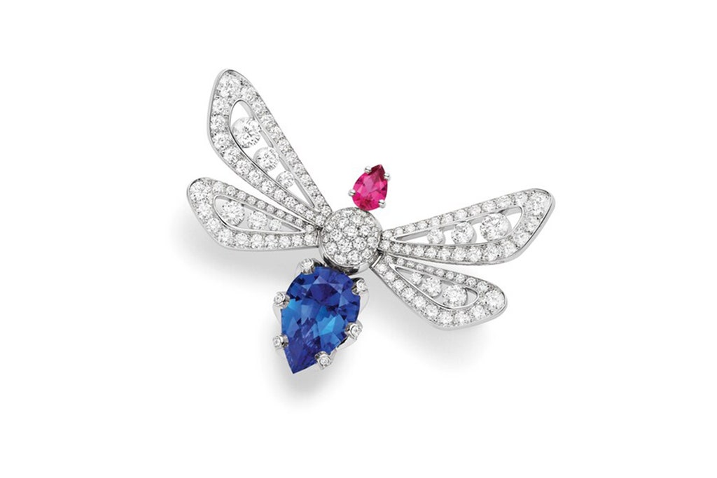 白金胸針,鑲嵌一顆鮮豔的粉色碧璽、一顆坦桑石和明亮式切割鑽石,價格POA,在Chaumet.com有售。