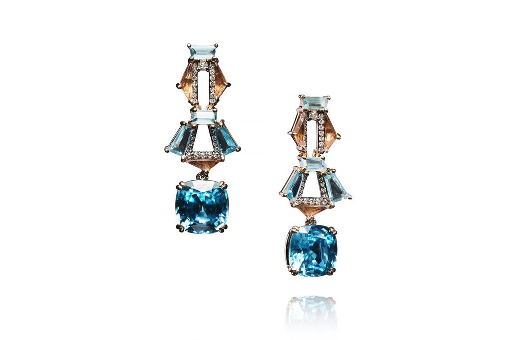 20K金和藍色鋯石耳環,鑲嵌安達盧西亞石和鑽石,12,596英鎊,在Nakarmstrong.com有售。