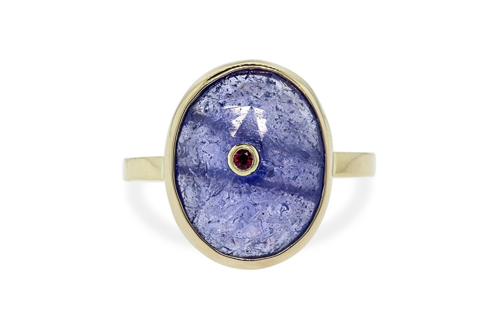 坦桑石和紅寶石戒指,黃金,795英鎊,Chincharmaloney.com有售。