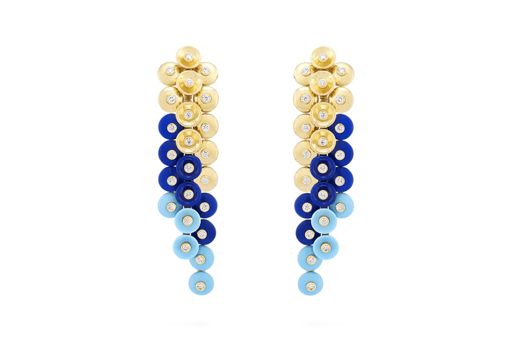 Bouton d’or耳環,黃金、青金石、綠松石、鑽石,25500英鎊,Vancleefarpels.com有售。
