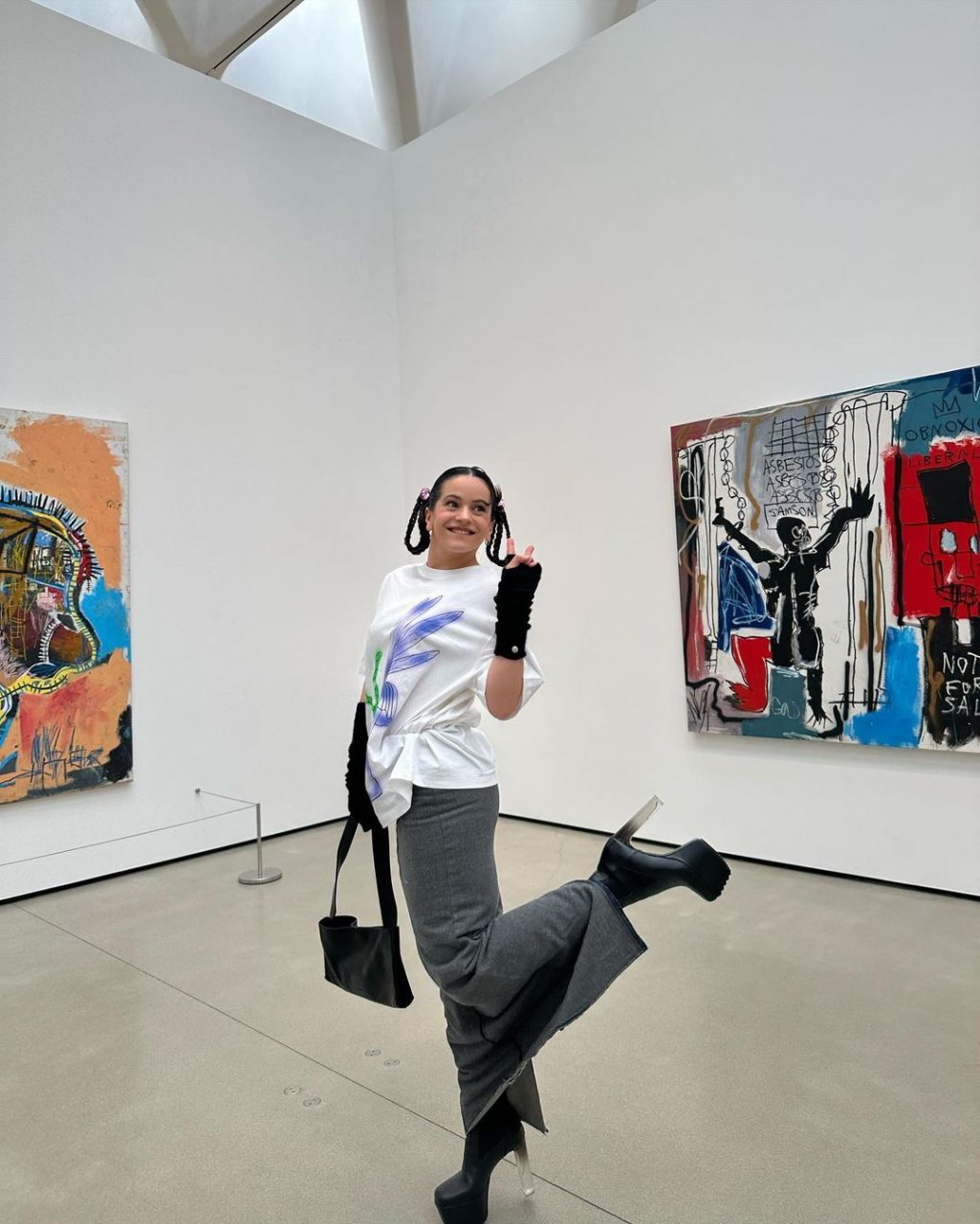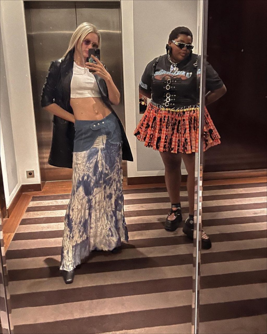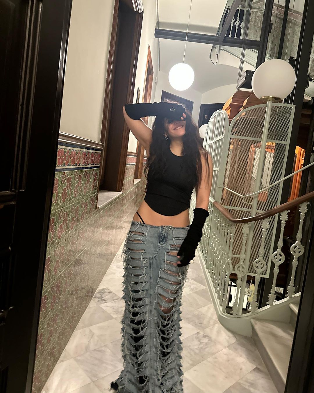 在西班牙流行小天后 Rosalía 與 Blackpink Lisa 的出遊照中,除了兩人的交情以外,雙方的衣着也為人所津津樂道。作為 Y2K 潮流擁戴者的 Rosalía,穿上了隨性的 Oversized T 恤以搭配深灰色的牛仔長裙,體型嬌小的她以 Rick Owen 的高跟長靴拉長整體身形比例。在另一張照片中,她還為我們展示了她的 DIY 流蘇長裙,將褲頭剪去後便能輕鬆將其改造成低腰剪裁,而隨性的多條橫切破洞,也讓裙子成為獨一無二的造型亮點單品。