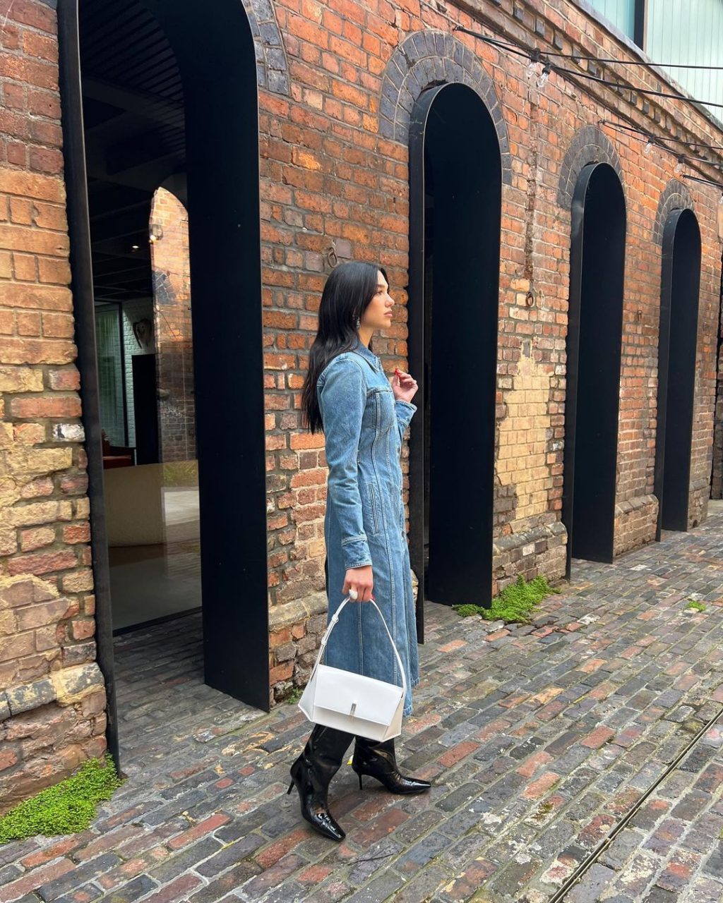 除了半身的牛仔長裙,像是 Dua Lipa 身上的牛仔連身裙也是個不錯的選擇。Levi’s 以牛仔外套搭配牛仔褲與牛仔靴的經典牛仔造型已經深入民心,而 Dua 身上的牛仔連衣裙便像是該牛仔造型的變奏版——在保留了經典氛圍的同時,加入現在的潮流元素。而這位女歌手在另一場合上身穿的 Blumarine 緊身連衣裙則帶出不一樣的氛圍,不僅更有女性魅力,延長的裙擺也完美符合特別日子穿着。