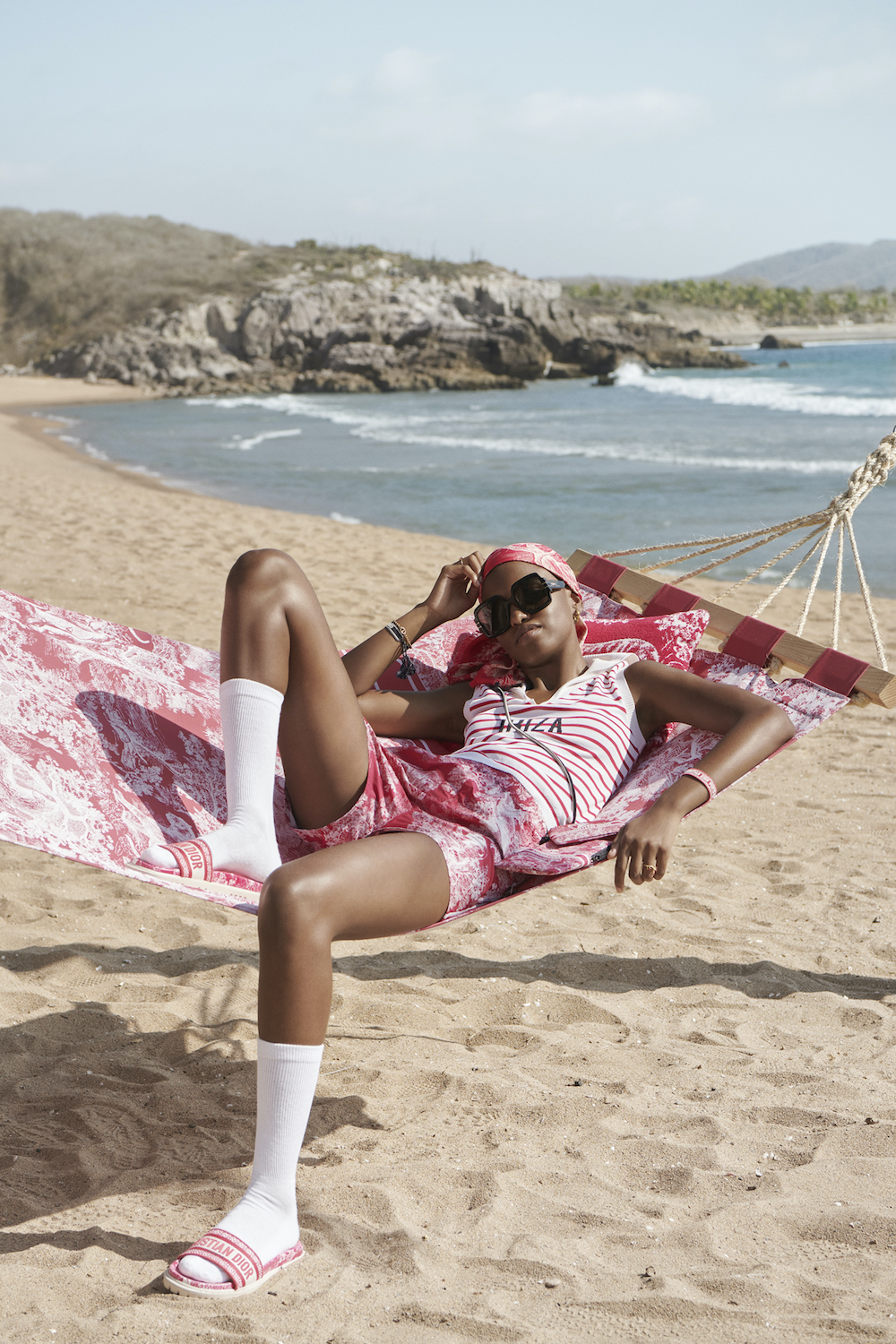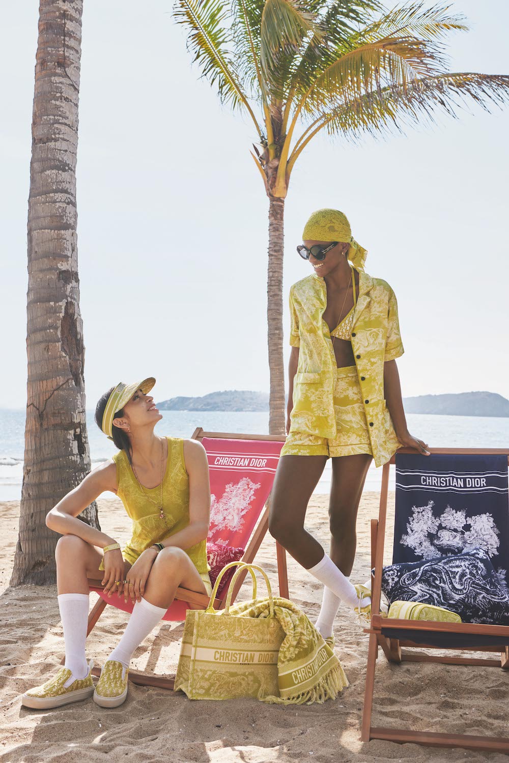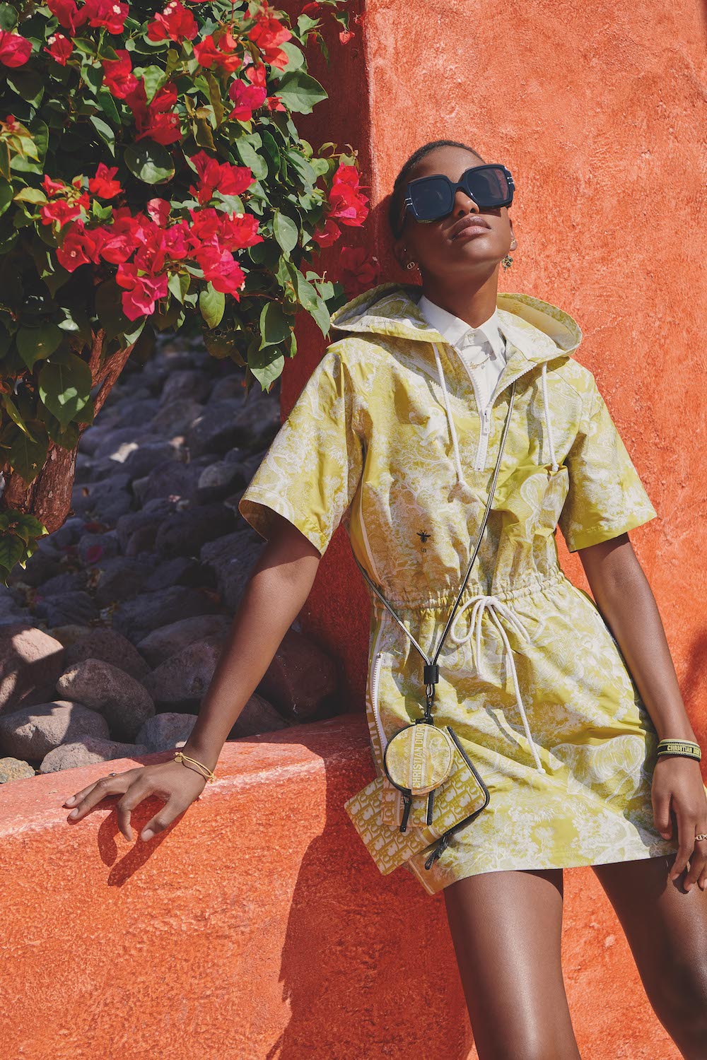 不可抗拒的Lady D-Lite、Dior Caro、Dior Book Tote手袋、D-Connect運動鞋、Dior Granville espadrilles、Dway mules以及DiorClub 披風、圍巾、珠寶和遮陽帽,還有印有夢想目的地名稱的新水手上衣,可以層層疊疊地佩戴,並有可更換的肩帶,使這個陽光明媚的衣櫥更加完美。