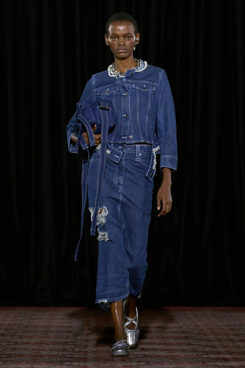 Simone Rocha在2025秋冬系列中,以修身牛仔外套和破洞微喇叭七分褲打造型格而不失優雅的Double Denim造型,搭配藍色牛仔手袋及銀色系帶平底鞋,頸部佩戴珍珠鏈條項鏈,散發剛柔並濟的魅力。