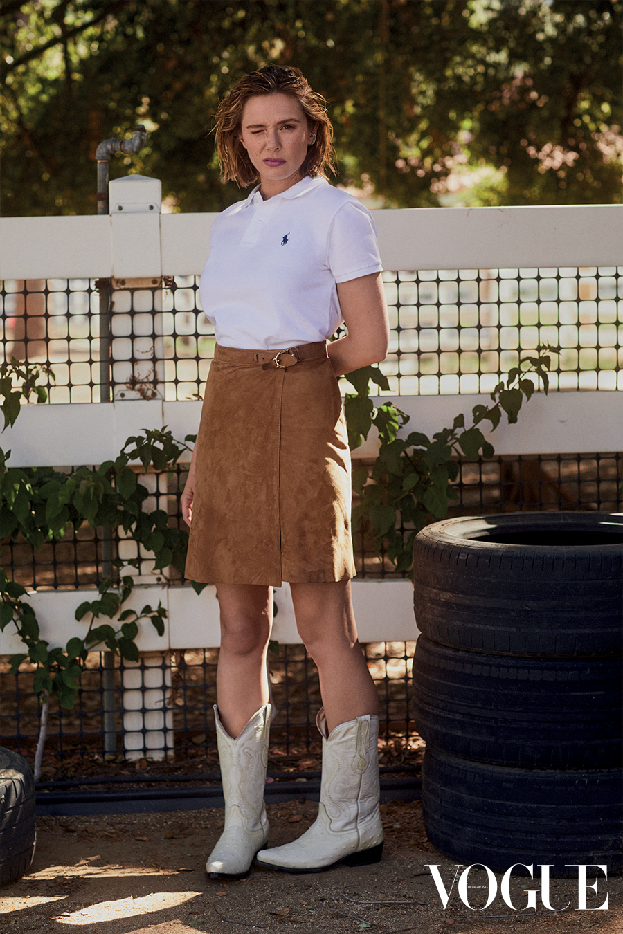 T-shirt and skirt, all Ralph Lauren. Earring, Ana Khouri.