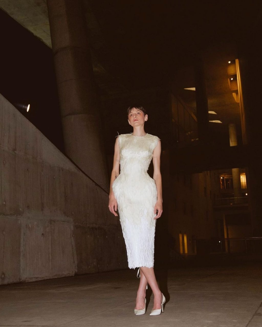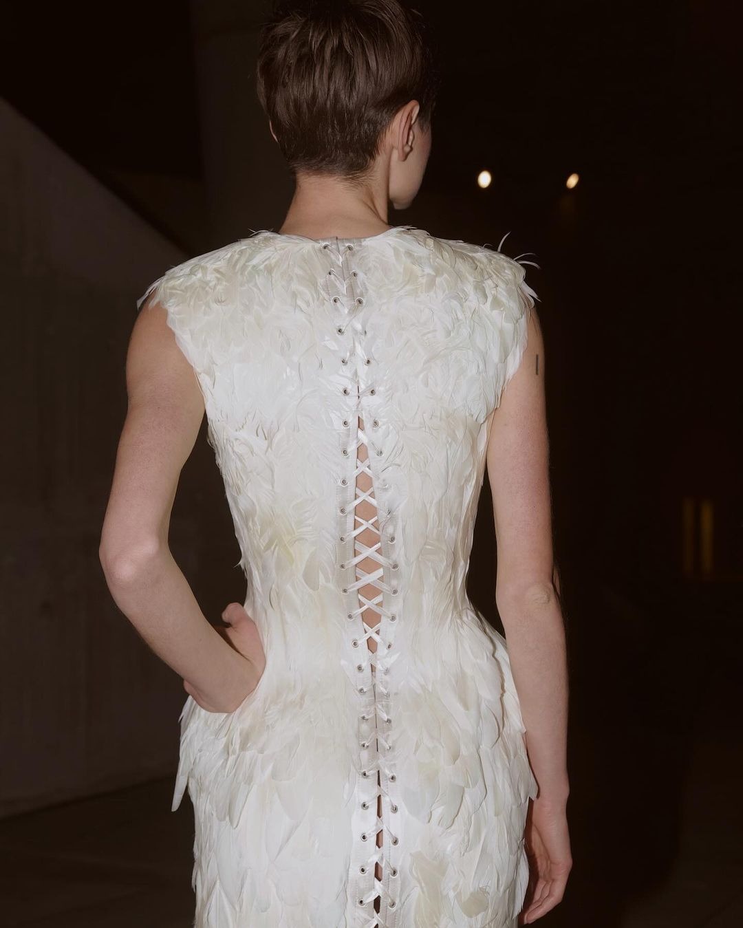 這條連身裙無疑令人聯想起 Lee McQueen在Alexander McQueen 的「The Horn of Plenty」和「Voss」系列中首次亮相的羽毛展品的後代。而它首次出現在 Dilara Findikoglu 的 2024 年秋冬系列時裝展上。連身裙採用了緊身胸衣結構。在腰間營造出沙漏效,背面則飾有Dilara Findikoglu 標誌性的孔眼細節,從頸部一直延伸到裙尾。
