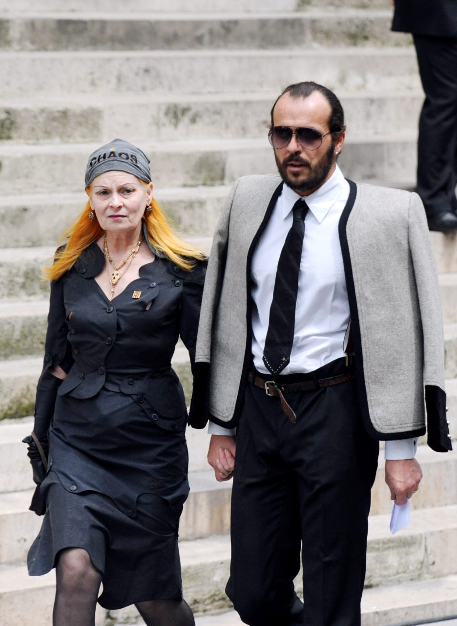 English fashion designer Vivienne Westwood (L) and her husband Andreas Kronthaler arrive at the Saint-Roch church to attend the funeral mass for fashion designer Yves Saint-Laurent, on June 5 2008 in Paris. Saint-Laurent, one of the 20th century's greatest couturiers, credited for revolutionising women's wardrobes, died on June 1, aged 71 of a brain tumour. AFP PHOTO BERTRAND LANGLOIS (Photo by BERTRAND LANGLOIS / AFP) (Photo credit should read BERTRAND LANGLOIS/AFP via Getty Images)