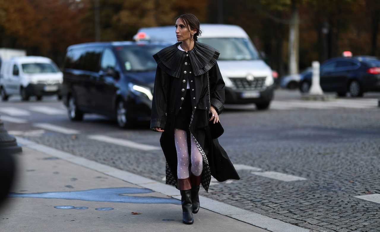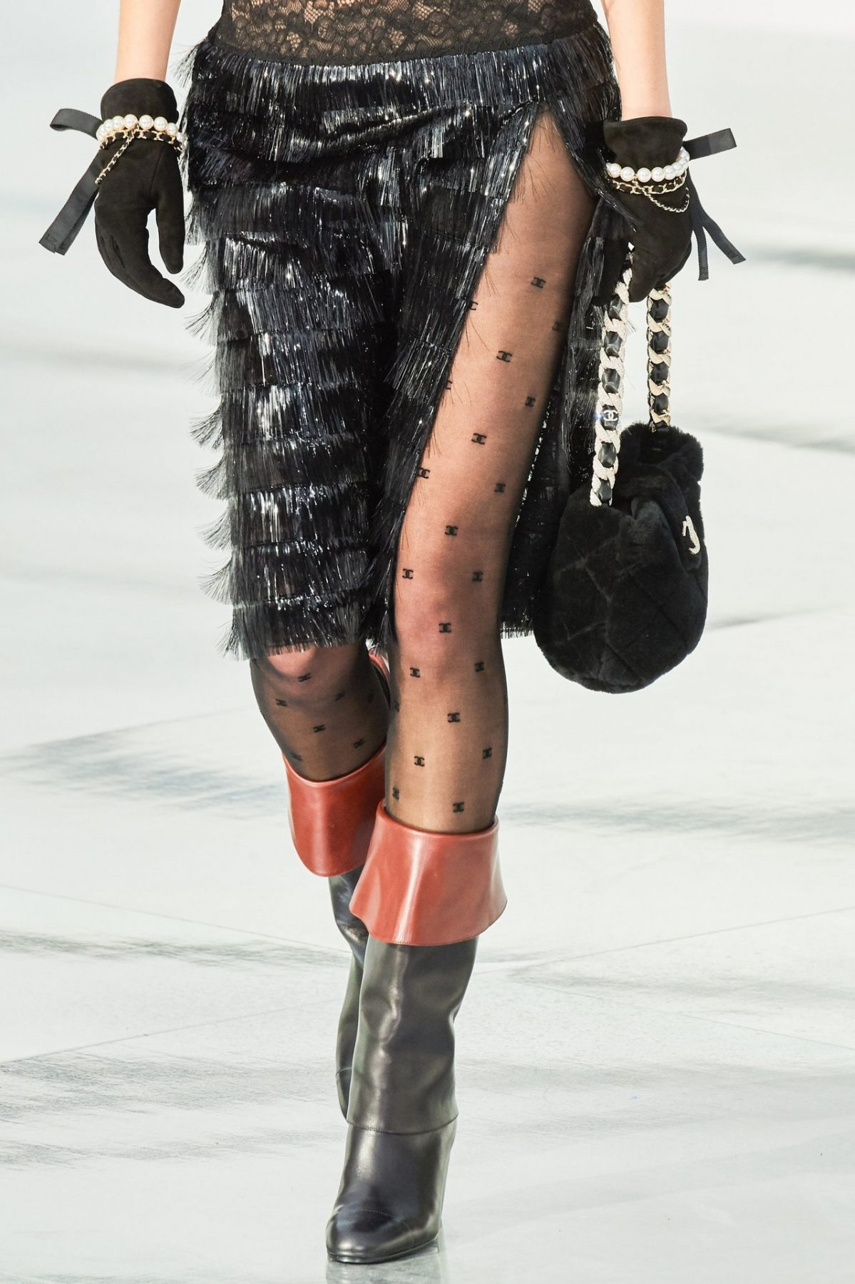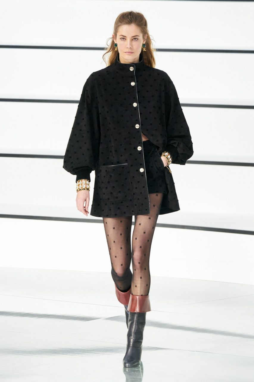 事實上,這對 Chanel 絲襪不是來自新一季的單品, Virginie Viard  在 2020/2021 秋冬時裝展以 Karl Lagerfeld 身著愛德華時代文藝復興時期服裝照片為靈感,打造出高大的馬術靴,讓大家驚嘆不已。具有剪裁的褲子和中長裙也佔據了主導地位。然而,黑色和白色帶有品牌的字母組合,雙“C”類似於圓點印花的絲襪一直受到時尚迷追捧。
